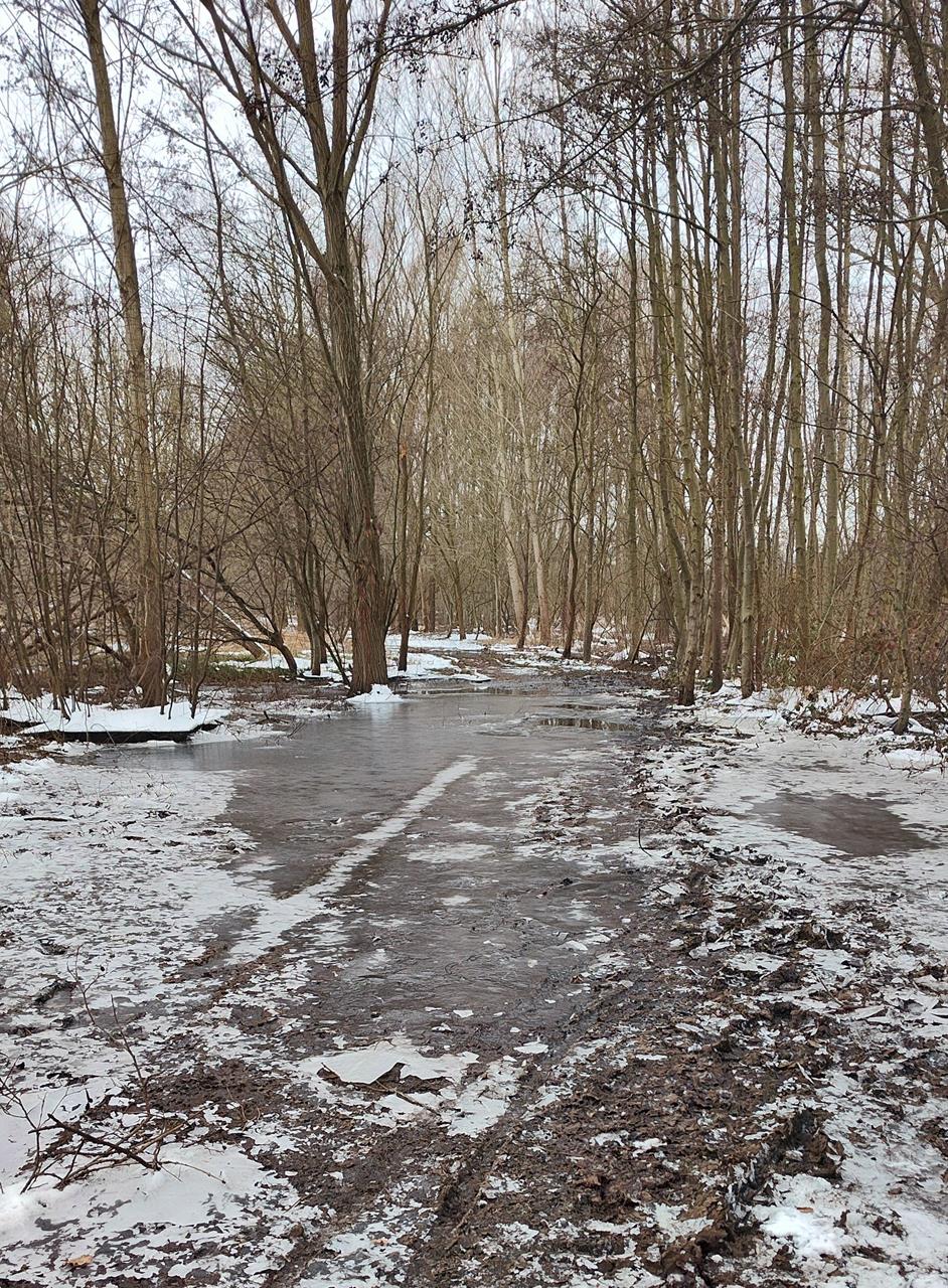 Zweimal kann ich den breiten Pfützen kaum ausweichen und breche prompt am Rande des Weges ein. Nicht tief, aber schön in den Matsch. Hätte ich doch meine Gummistiefel angezogen, dann wären meine Schuhe und meine Hose jetzt nicht nass und verdreckt. Na, ja, kann man alles waschen.