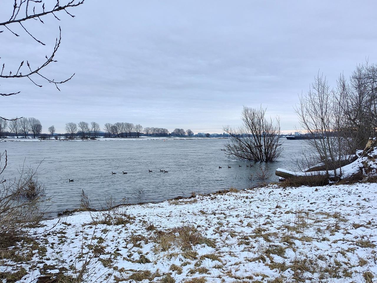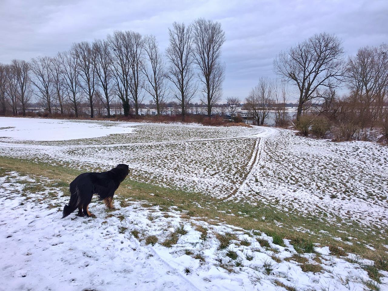 Heute kommt der Wetterwechsel: von minus 2 auf plus 11 Grad. Bevor der Schnee komplett wegschmilzt, drehe ich mit Doxi eine meiner Lieblingsrunden in der näheren Umgebung. Es geht durch das Naturschutzgebiet Ilvericher-Altrheinschlinge bei Meerbusch.
