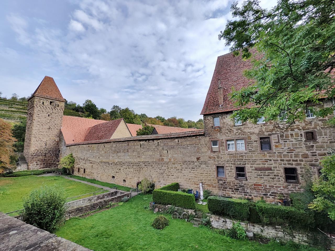 Hinter dem Scheuelberg laufen wir durch den schönen Wald Schartau und hinunter in den Ort Friedenstein, an dessen Nordflanke sich steile Weinberge erheben. Über den Ort Hohenklingen geht es dann erneut hinauf in den Wald und zurück zum Kloster, das wir nach 13 Wanderkilometern und gut drei Stunden wieder erreichen.