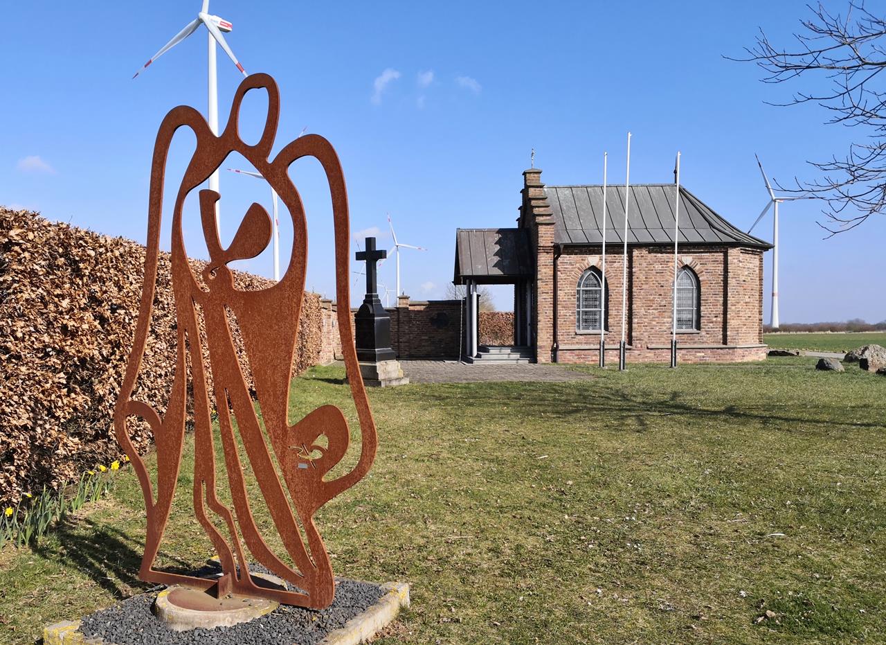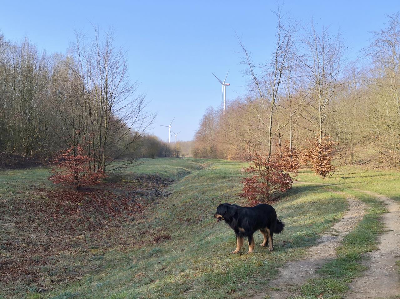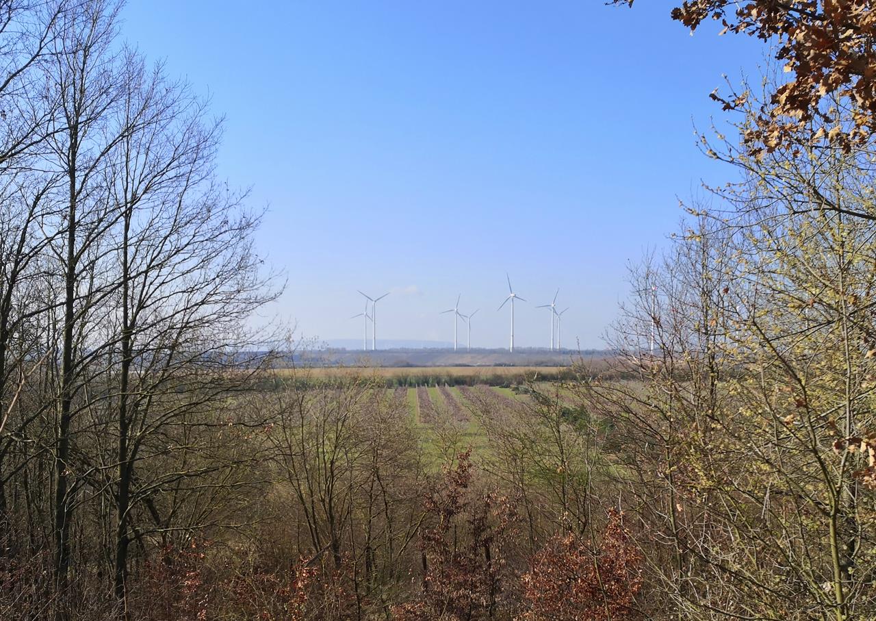 Von dort laufen wir in westlicher Richtung zur rekultivierten Königshovener Höhe, auf der zwischen Feldflächen zahlreiche große Windräder stehen.Im Westen geht der Blick zur mächtigen Sophienhöhe bei Jülich, nach Osten blicken wir zu den großen Braunkohlekraftwerken bei Grevenbroich.