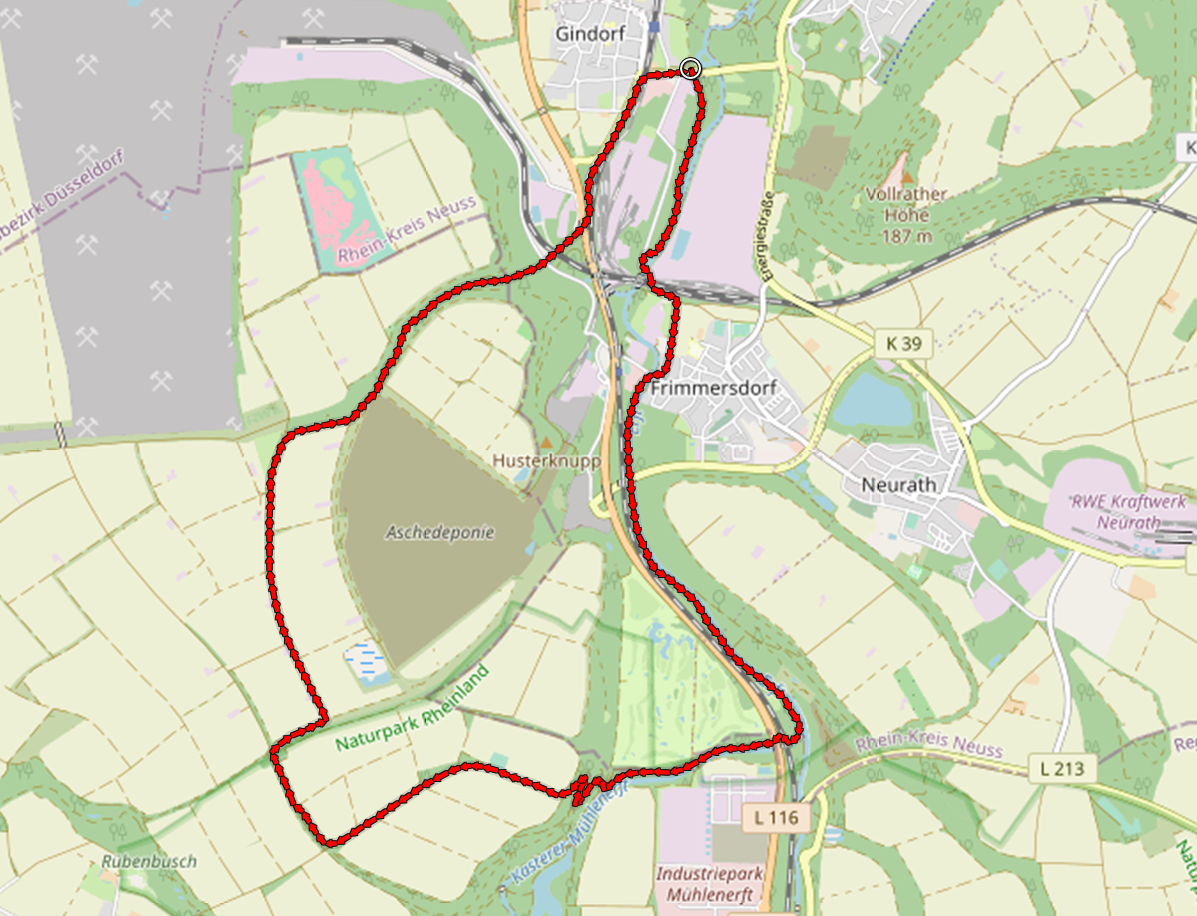 Nach einigen Kilometern erreichen wir Frimmersdorf. Dort geht es auf einer Länge von mehr als einem Kilometer am Werksgelände des Braunkohlekraftwerks Frimmersdorf entlang. Einstmals war die Anlage mit ihren 16 Blöcken eines der größten Kraftwerke in Deutschland und die größte CO2-Schleuder in ganz Europa. Gut, dass das die Anlage mittlerweile stillgelegt ist.