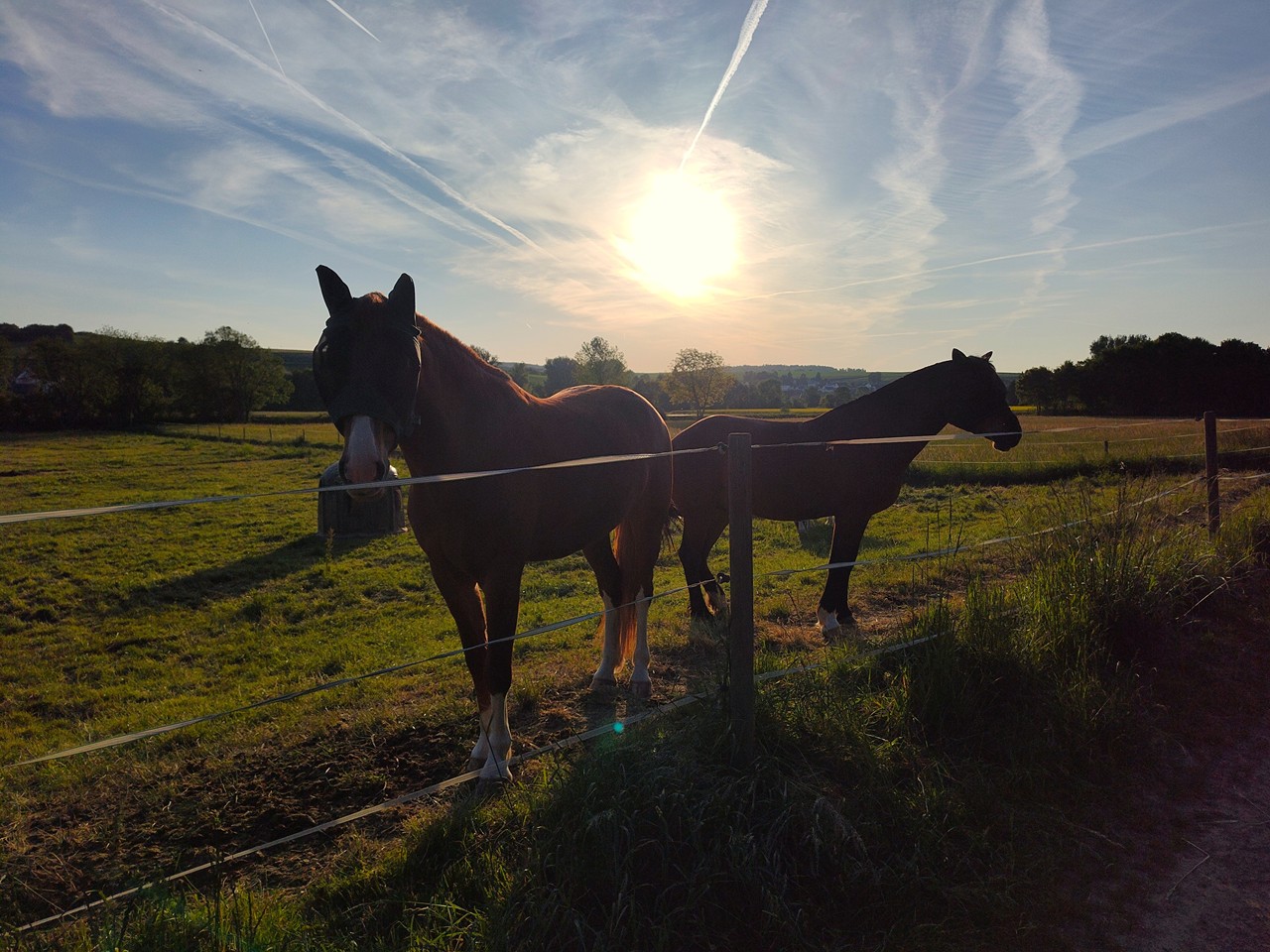 Am Abend erkunde ich mit Doxi die leicht hügelige Umgebung unseres Stellplatzes. Viele Pferdeweiden gibt es hier und Feldflächen mit Weizen. Dazwischen immer wieder einzelne Baumgruppen, aber nur wenige asphaltierte Feldwege. Dafür frisch gemähte Traktorwege und Trampelpfade, denen auf wir auf einer 6 km Runde folgen.