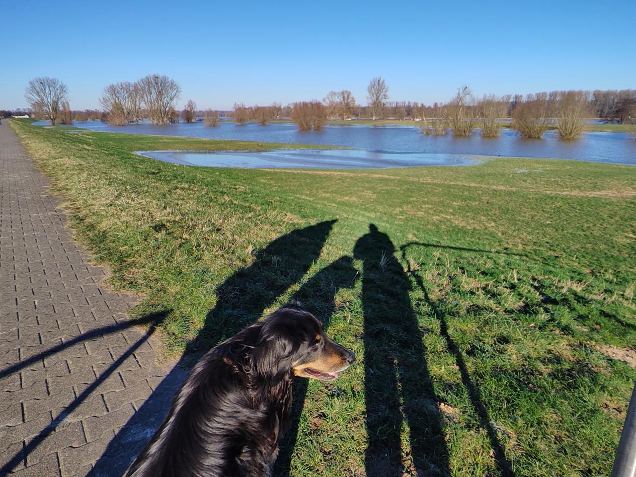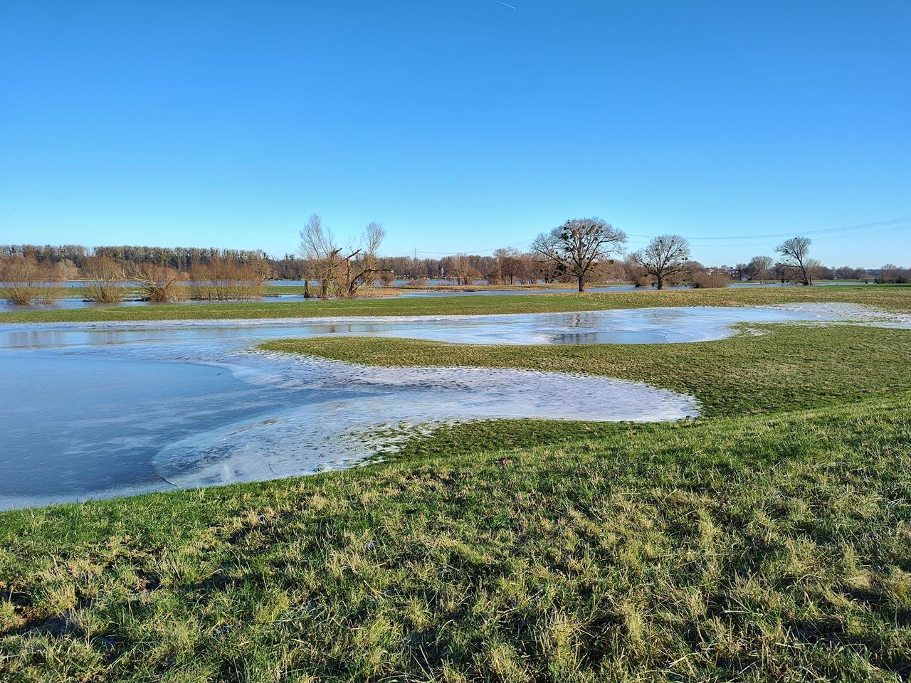Auch wenn dort das Rheinhochwasser in den letzten Tagen spürbar gefallen ist: Die Uferwiesen sind immer noch überschwemmt und stellenweise bereits gefroren.