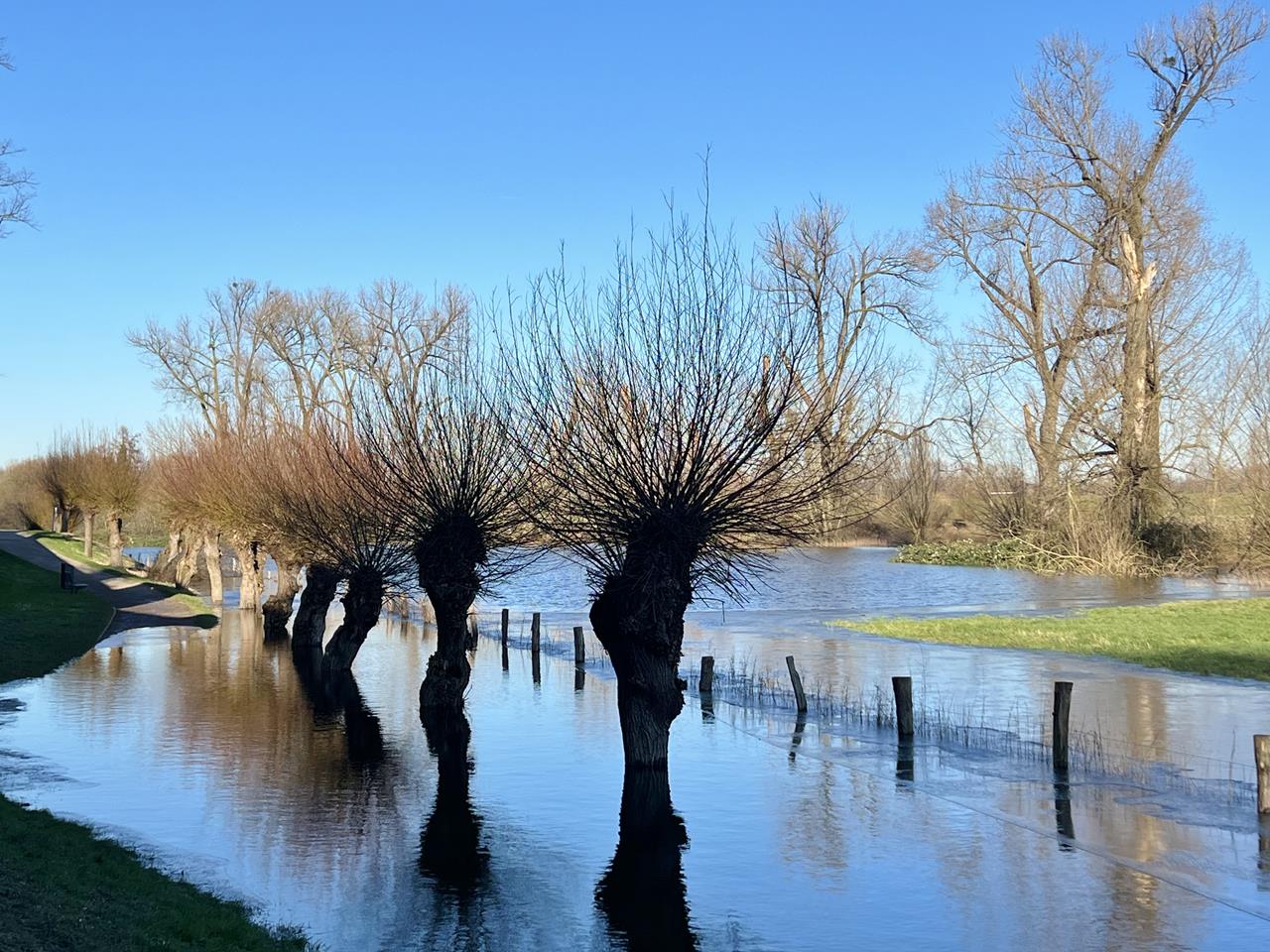 Vor der historischen Kulisse der Festung Zons boten uns die grünen Wiesen, die spiegelnden Wasserflächen am Rhein in Verbindung mit dem strahlend blauen Himmel und den winterlich kahlen Weidenbäumen einen wunderbaren Kontrast.