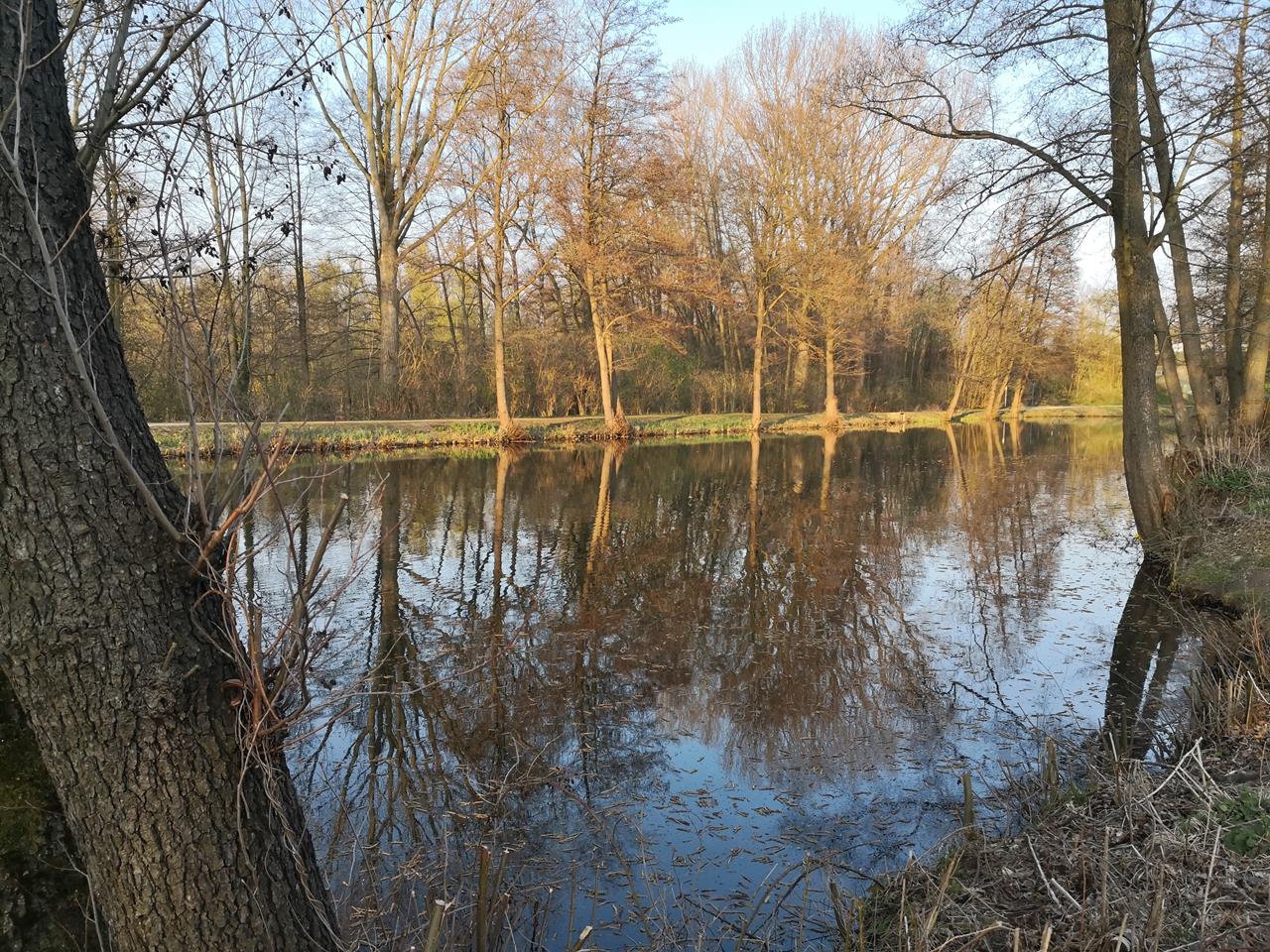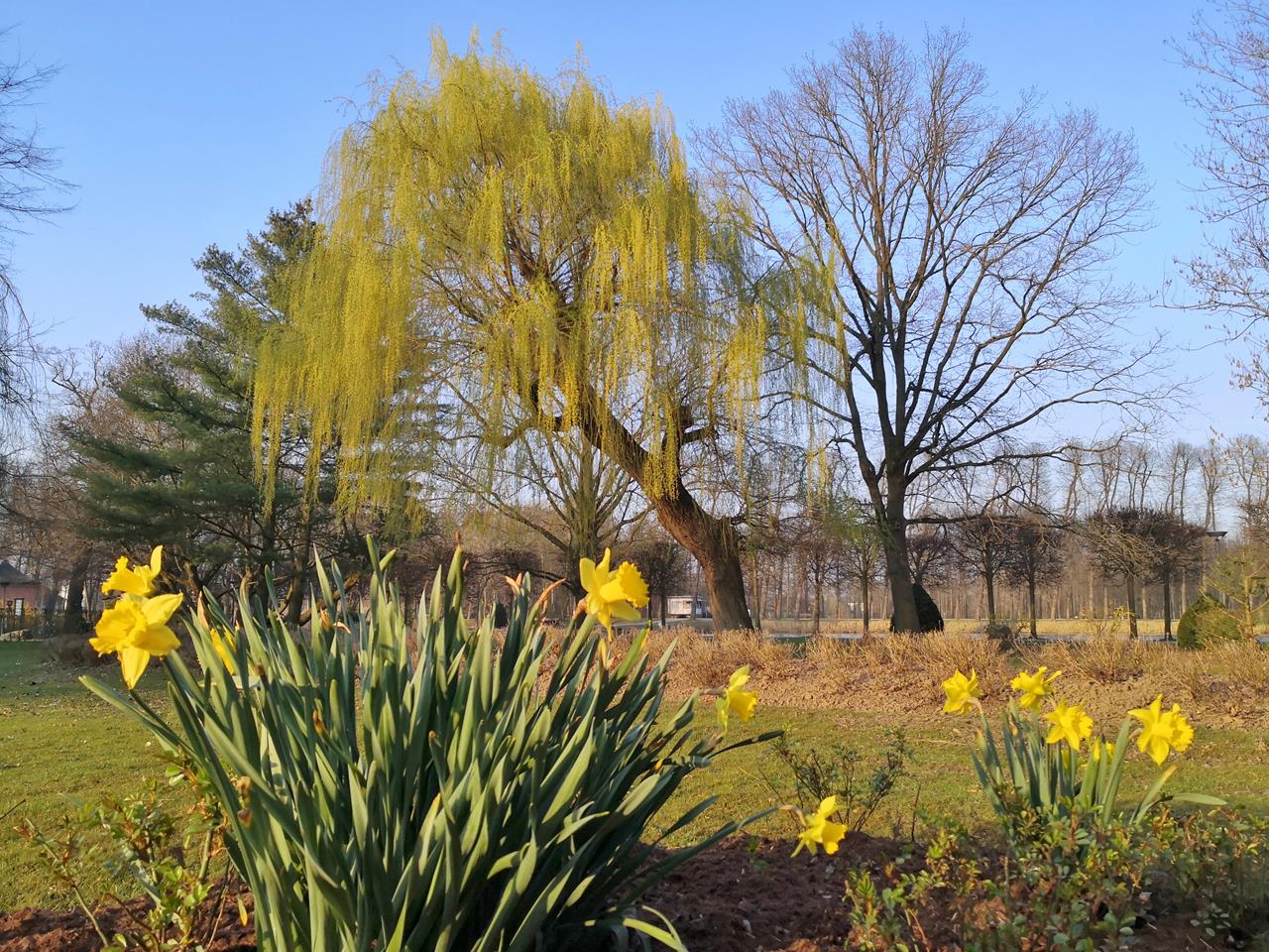 Ich bin hier, weil ich den Platz austesten und mit Doxi das Frühlingserwachen im Schlosspark bewundern möchte. Große Flächen mit Narzissen leuchten bereits wunderbar gelb und auch die juvenilen Kirschbäume südlich des Schlosses sind bereits erblüht. Da lohnt es sich doch, einen kurzen Zwischenstopp einzulegen.