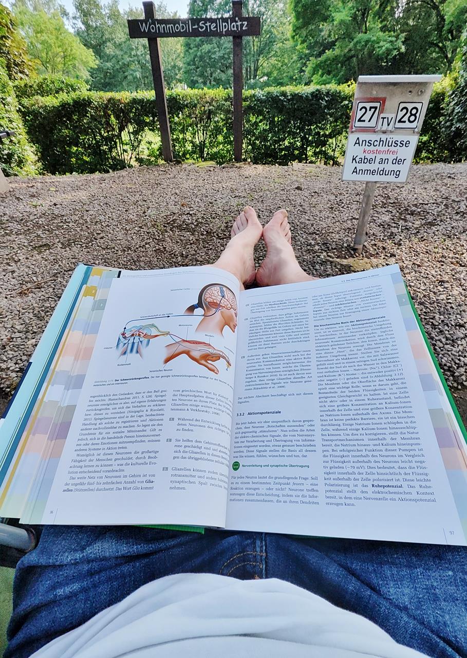 Die eine Hälfte des Tages verbringe ich mit Wandern und Yoga, den Rest mit Arbeiten oder Lernaufgaben am Computer. Derzeit bereite ich mich auf mein Studium der Psychologie vor, das offiziell am 1. Oktober beginnt. Damit geht der Lernstoff in den kommenden Jahren so schnell wohl nicht mehr aus 😉
