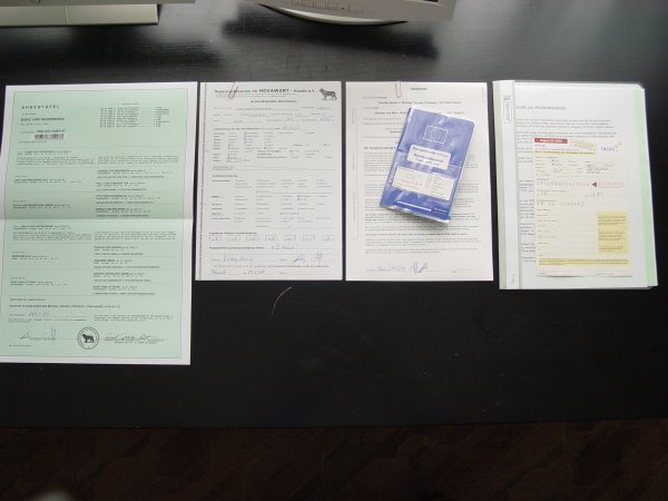 Jeder Welpe wird mit zahlreichen Papieren abgegeben: Ahnentafel, Wurfabnahmeprotokoll inkl. Wesenstest, Kaufvertrag, Impfpass, Informationsmaterial zur Fütterung und zum Wesenstest, sowie ein Merkblatt über Giftpflanzen im Garten. Da kommt einiges zusammen.