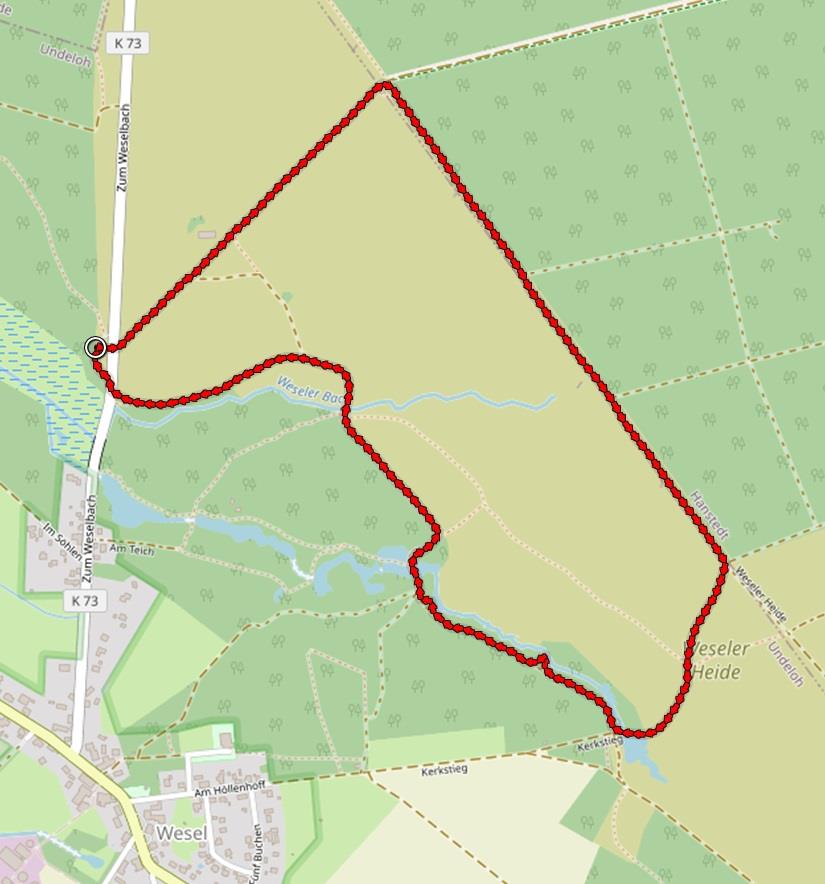 Die 6 km lange Runde geht durch das leicht hügelige Terrain der Weseler Heide und auch an einigen Wasserflächen vorbei. Am Horizont erheben sich die Hanstedter Berge in einem größeren, durchgängigen WaldgebietIn der Heide zeigen einige Frühjahrsblüher noch ihr gelbes Prachtkleid, doch die Heidekräuter blühen noch nicht. Das beginnt frühestens in sechs Wochen.