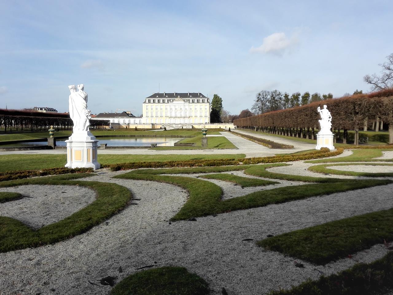 Und weil ich Weihnachtsmärkte und Glühwein so gar nicht liebe, gehe ich in dieser Zeit mit Doxi am Brühler Schloss Augustusburg und seinen schönen Gärten spazieren. Ich vermute, zu dieser Uhrzeit ist hier nur an ganz wenigen Tagen im Jahr so wenig los wie heute. Aber da die Sonne scheint, kann man das natürlich wunderbar für Fotoaufnahmen nutzen. So fängt der Heiligabend gut an …