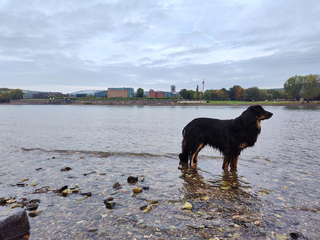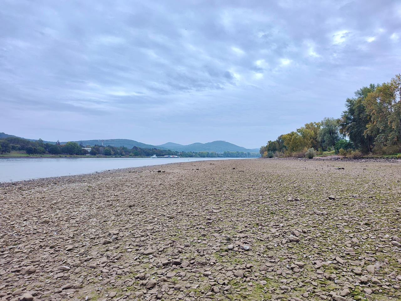 Der kostenlose Womo-Stellplatz der Stadt liegt an einer viel befahrenen Straße, aber auch direkt am schönen und großen Rheinauenpark, der sich bis hinunter zum Flussufer zieht.Anders als bei Karlsruhe führt der Strom hier bereits wenig Wasser. Entlang des Ufers ziehen sich breite, trocken gefallene Kiesbänke. Von dort kann man in südlicher Richtung schön zum Siebengebirge blicken.