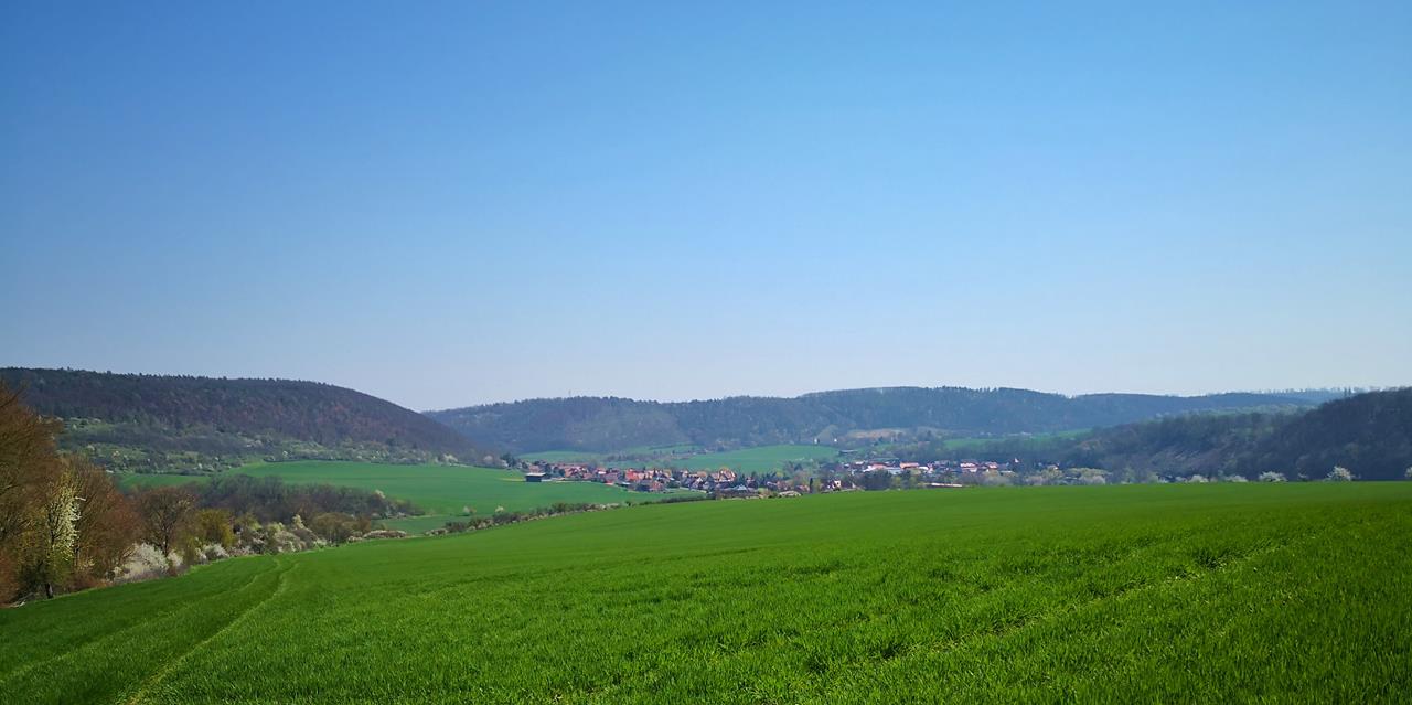 Blick von den Hügeln oberhalb der Arche Nebra hinunter zur Stadt Nebra