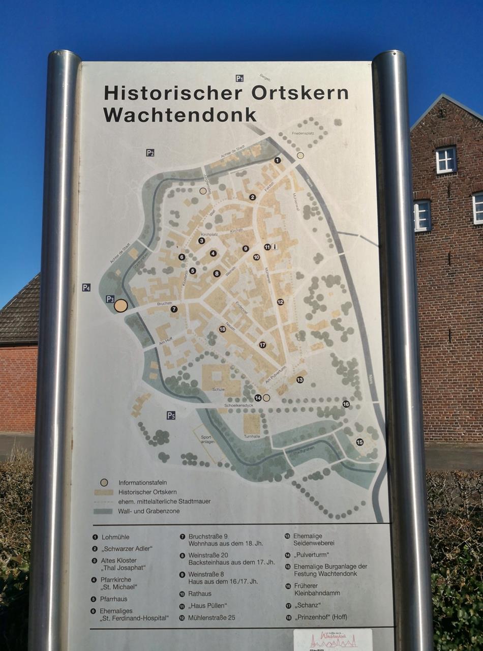 Wachtendonk liegt im Süden des Kreises Kleve am unteren Niederrhein nahe der niederländischen Grenze bei Venlo.Die Stadt erhielt bereits 1343 die Stadtrechte und wurde mit Gräben und einer Stadtmauer befestigt.