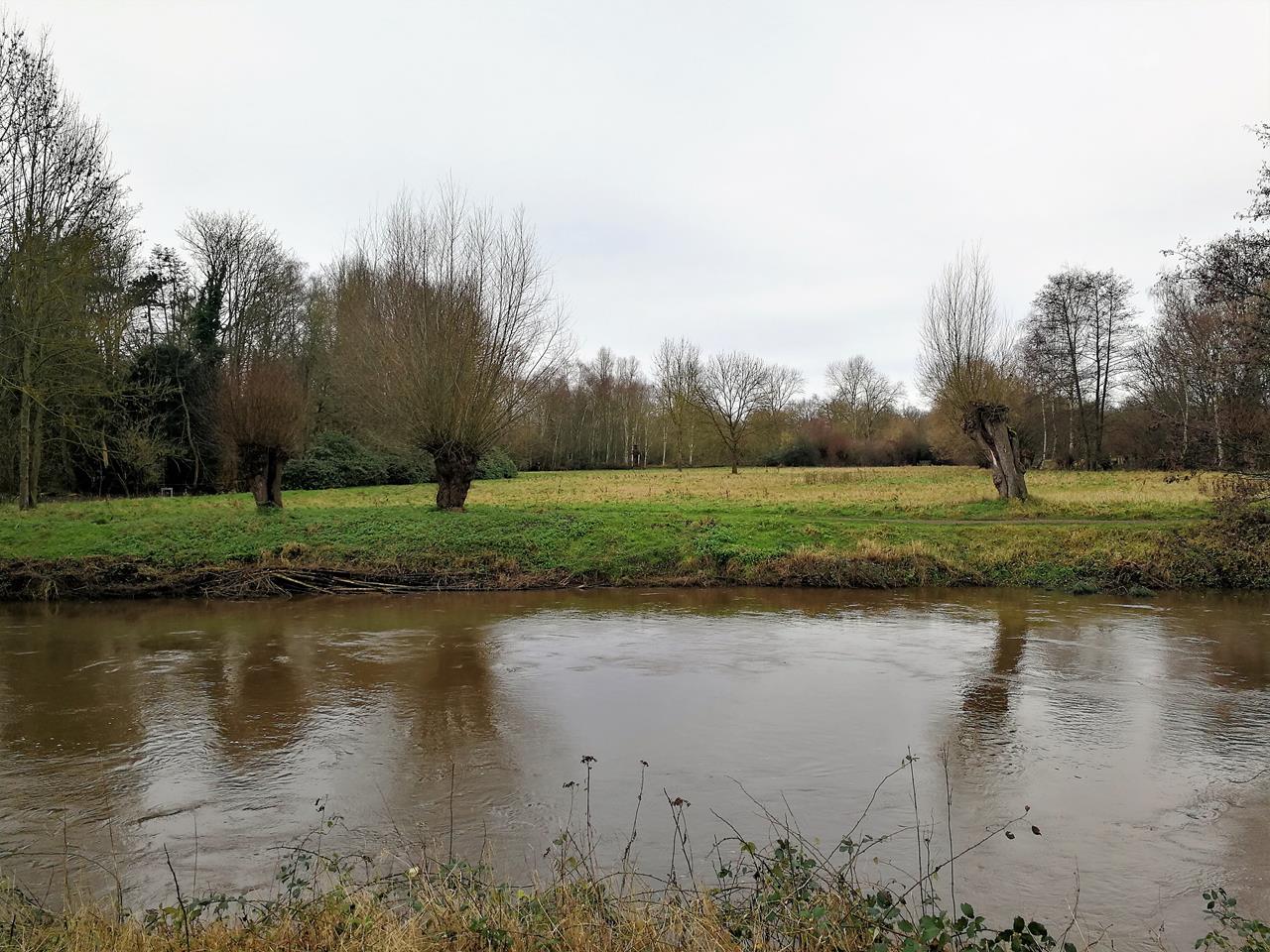 Unsere Wanderung beginnt an der Bezirkssportanlage in Neuss-Weckhoven. Schon nach wenigen hundert Metern erreichen wir die Erft, die derzeit Hochwasser führt.