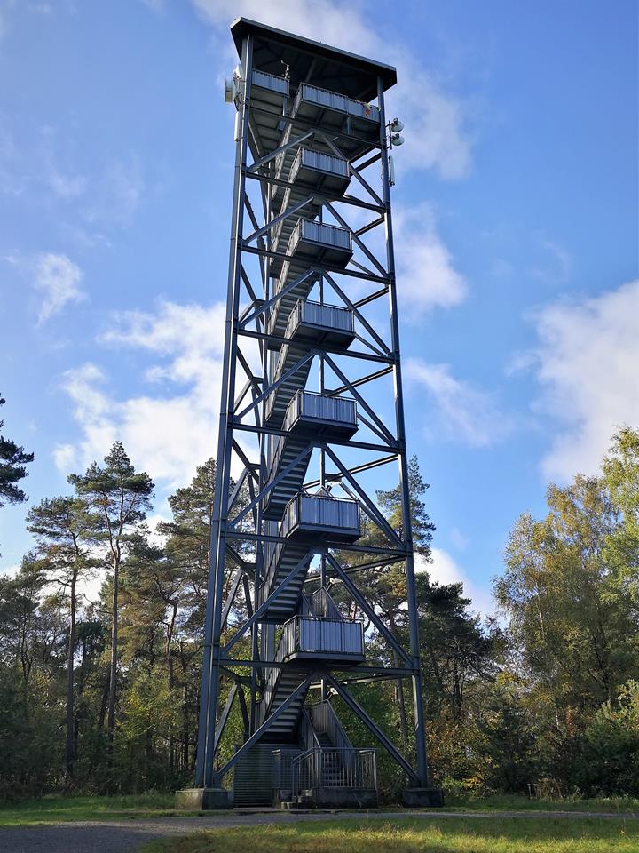Auf der Hälfte der Wanderung erreichen wir in der Nähe des Farnberggipfels den höchsten Punkt unserer Tour. Hier besteigen wir den 38 Meter hohen Feuerwachturm Farnberg, der einen tollen Fernblick über die Haard bis zum Ruhrgebiet und in das Münsterland ermöglicht. Während uns unten im Wald die Herbstsonne wärmt, ist es hier oben ganz schön kalt und windig. Aber die Aussicht ist wirklich fantastisch.