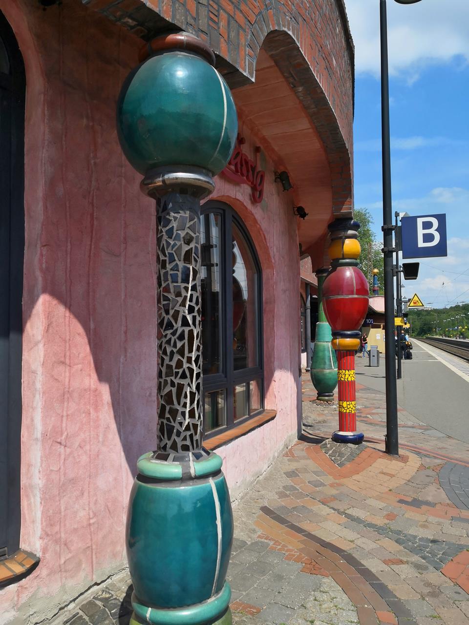 Der „Hundertwasser-Bahnhof Uelzen“ ist seitdem ein echter Blickfang, der unverkennbar die typische Handschrift des bekannten Künstlers trägt: Bunt verkleidete Säulen mit goldenen Kugeln an ihrer Spitze, organische Formen und verspielte Fliesen- und Mosaikflächen prägen das Bild. Schon allein dafür hat sich der Abstecher nach Uelzen absolut gelohnt.