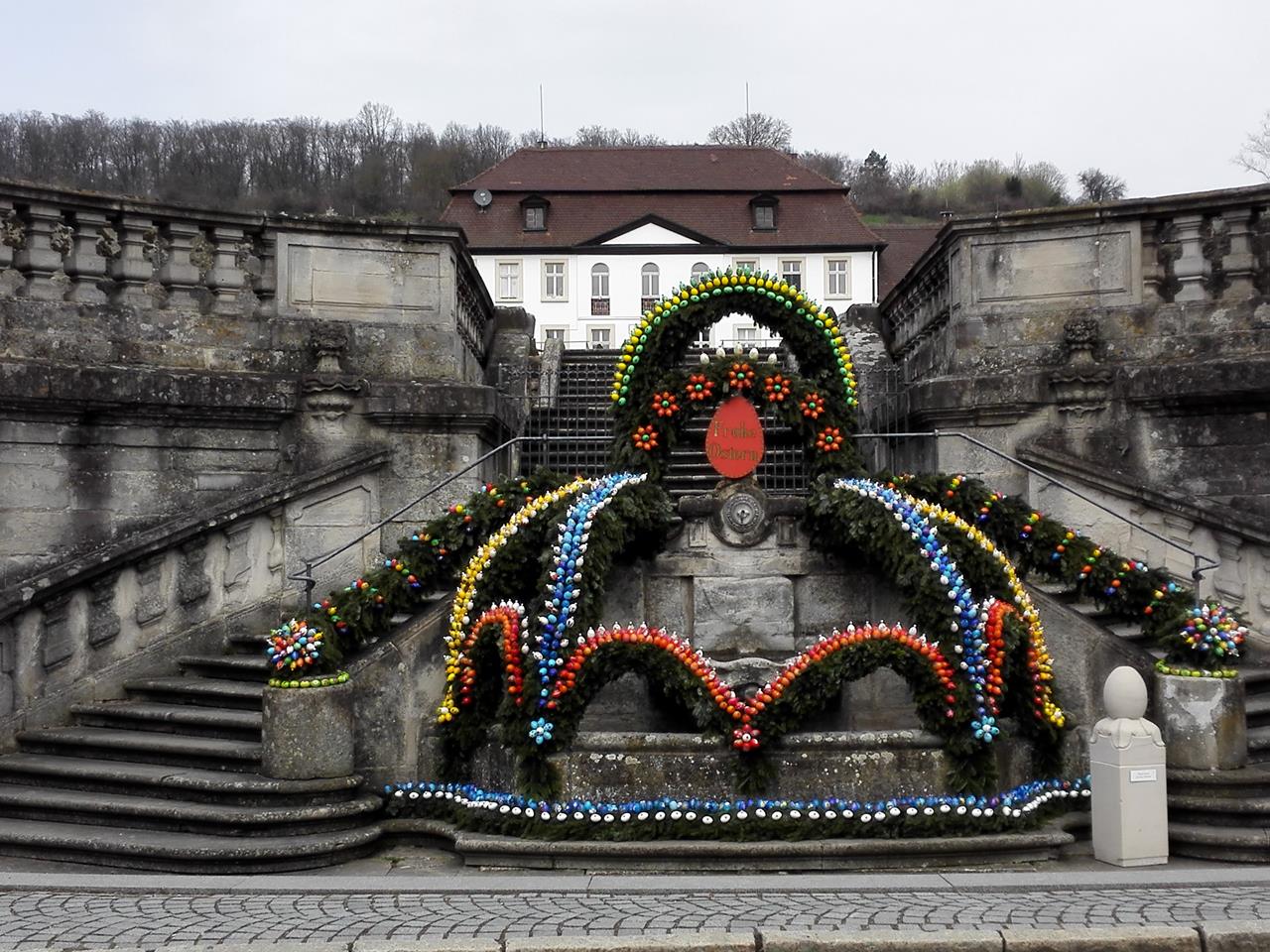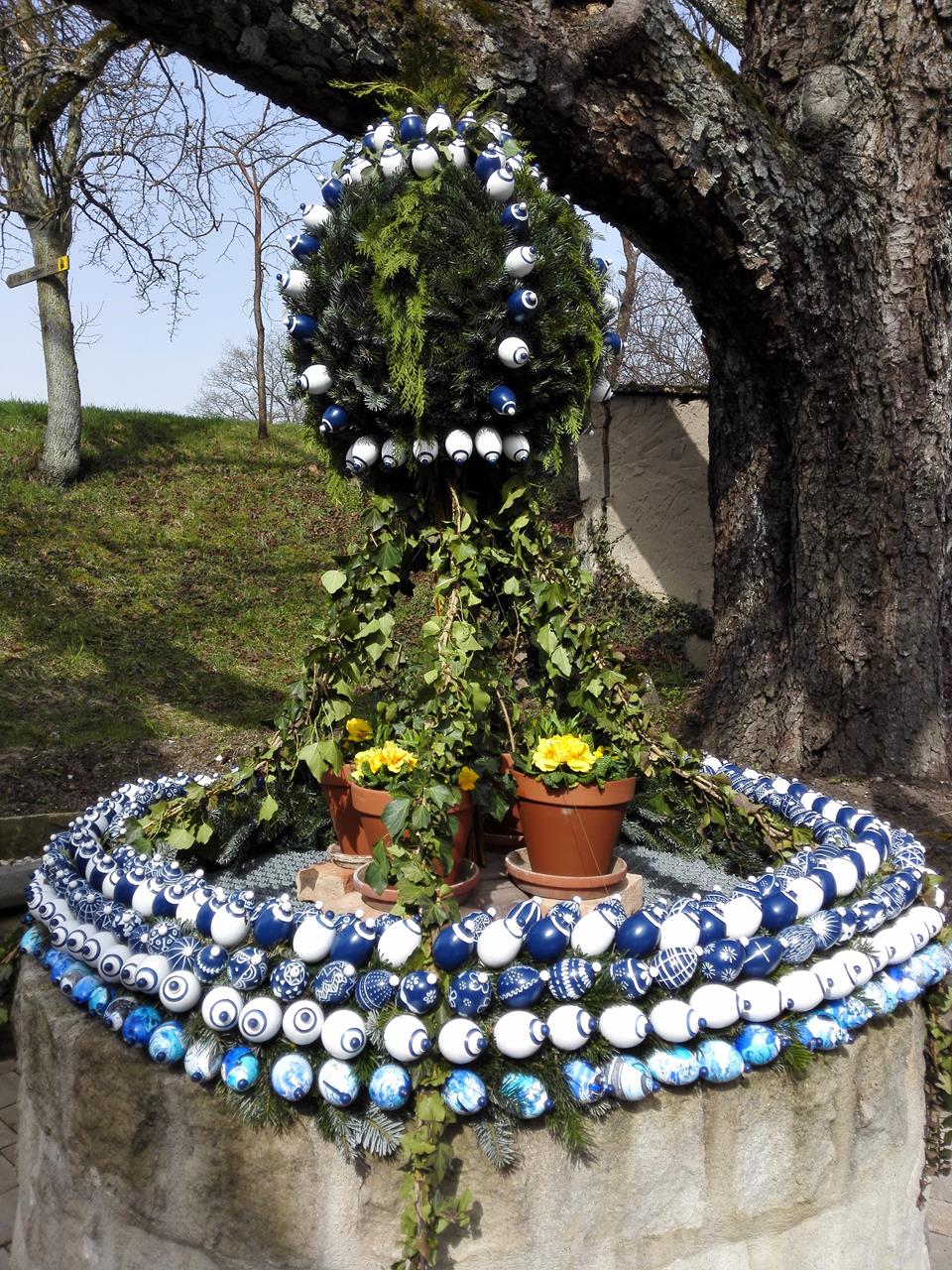 Von dort geht es über eine wenig befahrene Asphaltstraße zur kleinen Rochuskirche und zum Ort Großgressingen. Wie auch in den anderen Orten auf unserem heutigen Weg ist der Dorfbrunnen dort liebevoll österlich geschmückt.