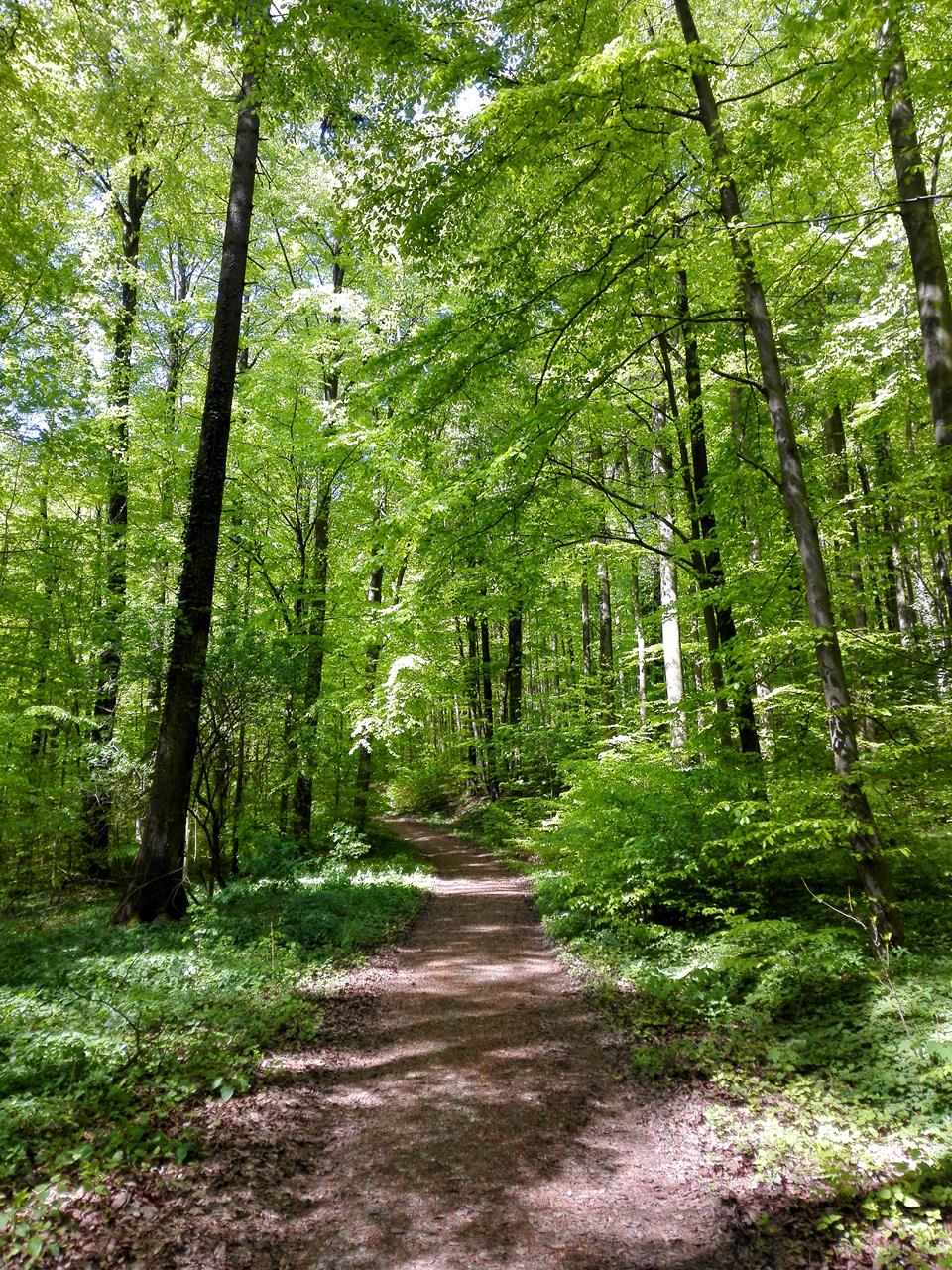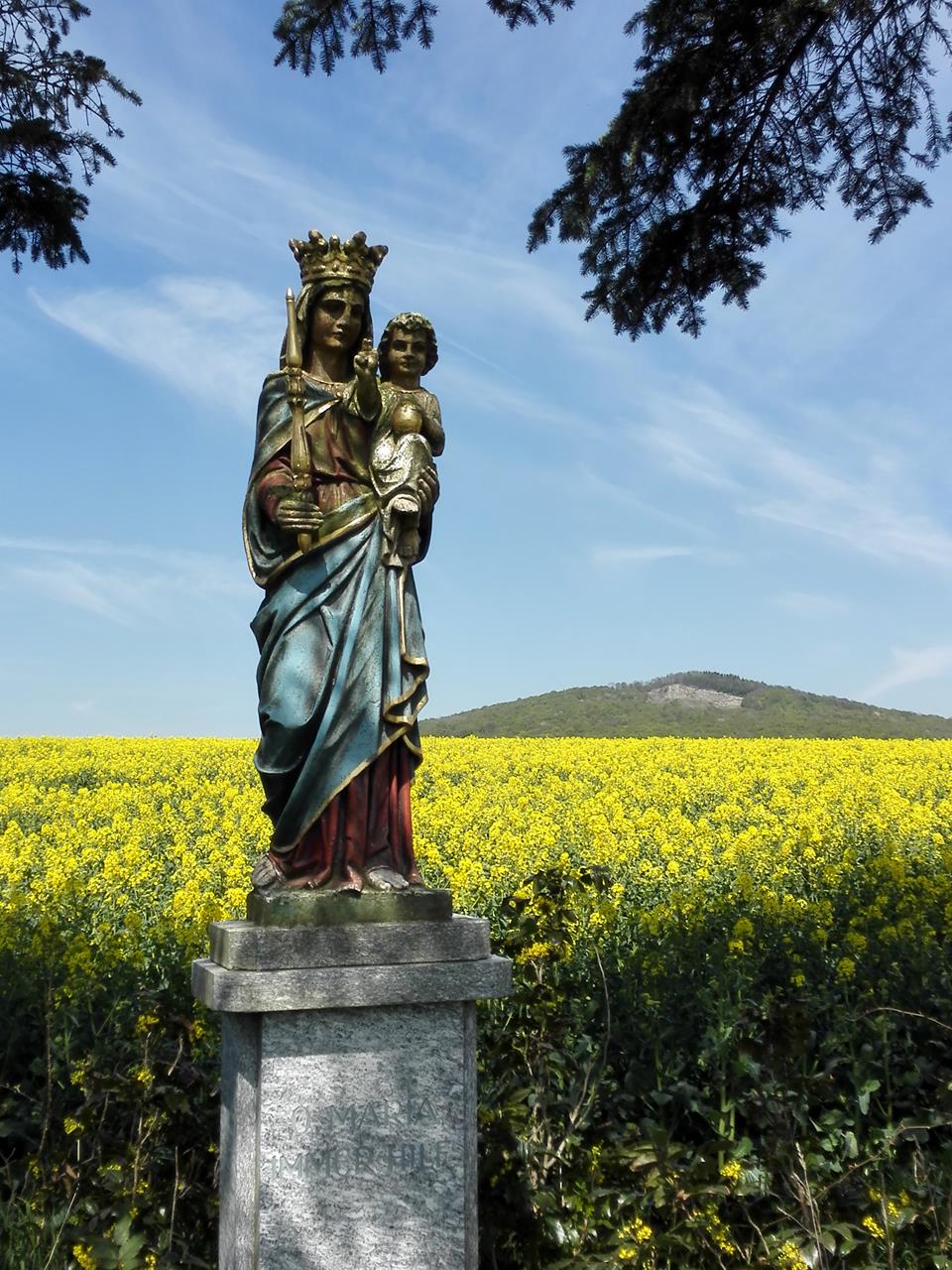 Durch den frisch ergrünten Wald geht es weiter in Richtung der Ruine Haselstein, an deren Fuß eine imposante Mariengrotte den Wanderer grüßt.