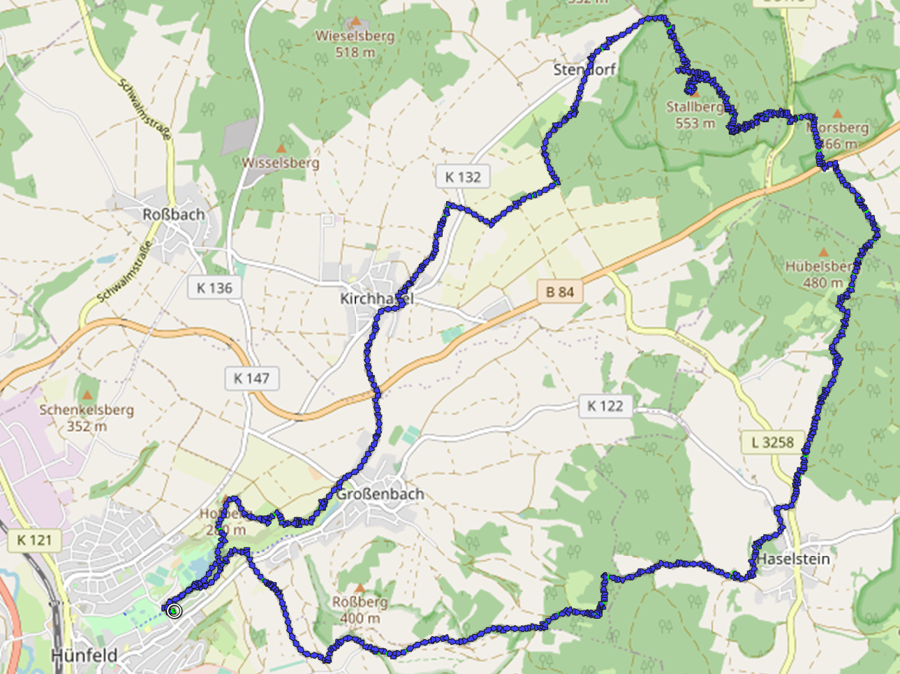 Damit haben wir den höchsten Punkt unserer heutigen Tour erreicht. Abwärts geht es durch Wald und offene Feldflächen über Stendorf, Kirchhasel und Großenbach zurück nach Hünfeld. Über weite Strecken begleitet uns dabei die mäandernde Hasel, aus der Doxi immer wieder eine Wasserprobe entnimmt.