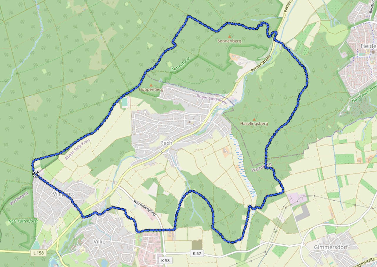 Heute waren wir mit Doxi im Kottenforst südwestlich von Bonn unterwegs. Die 16 km lange Tour startete am Rand des kleinen Örtchens Villiprott und führte uns größtenteils durch Wald rund um die Gemeinde Wachtberg, zu der auch Villiprott gehört.