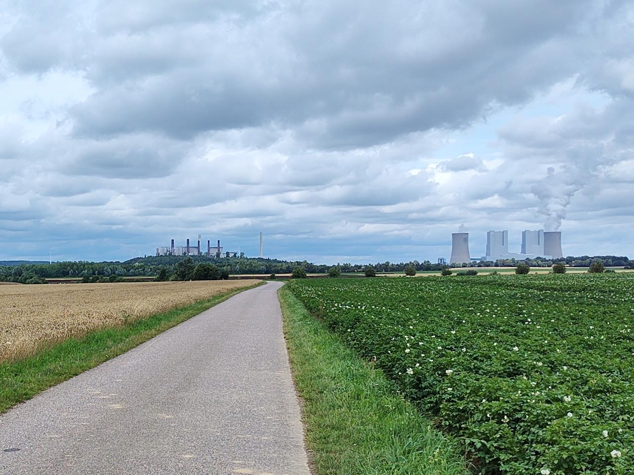 Blickt man nach Norden und Osten, erheben sich die riesigen Türme gleich dreier Braunkohlekraftwerke: Neurath I (außer Betrieb), Neurath II und Niederaußem.