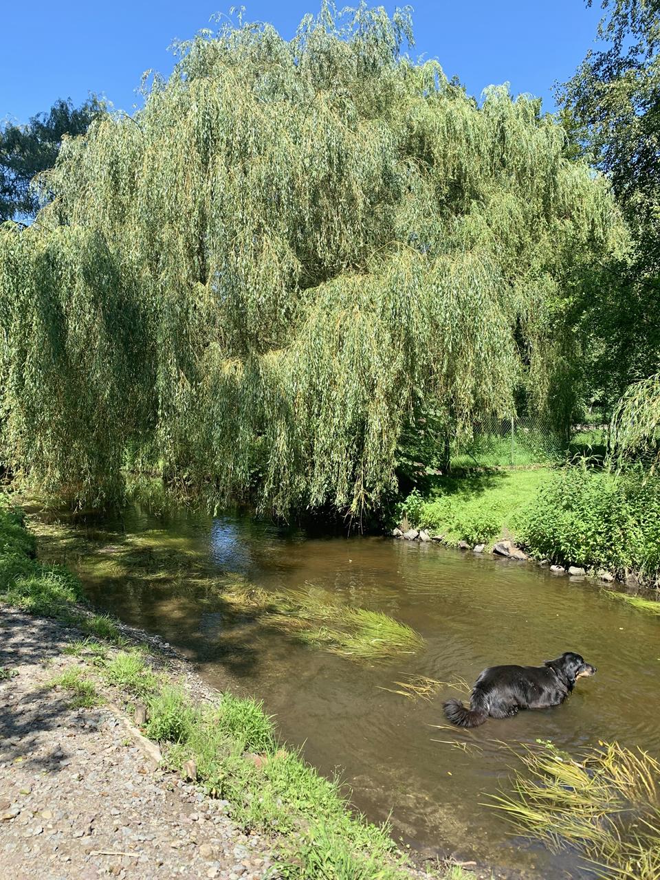 Hinter der Lüttelforster Mühle ziehen wir an einem kleinen Wehr die Schuhe aus und staksen durch das herrlich kühle Wasser der Schwalm, die hier kaum 30 Zentimeter tief ist. Doxi genießt es, den Stöckchen im Wasser hinterherzuspringen, und es dauert nicht lange, da kommen auch andere Hunde und tun es ihr gleich. Ein wirklich schönes Stück Natur ist das hier, nördlich von Wegberg.