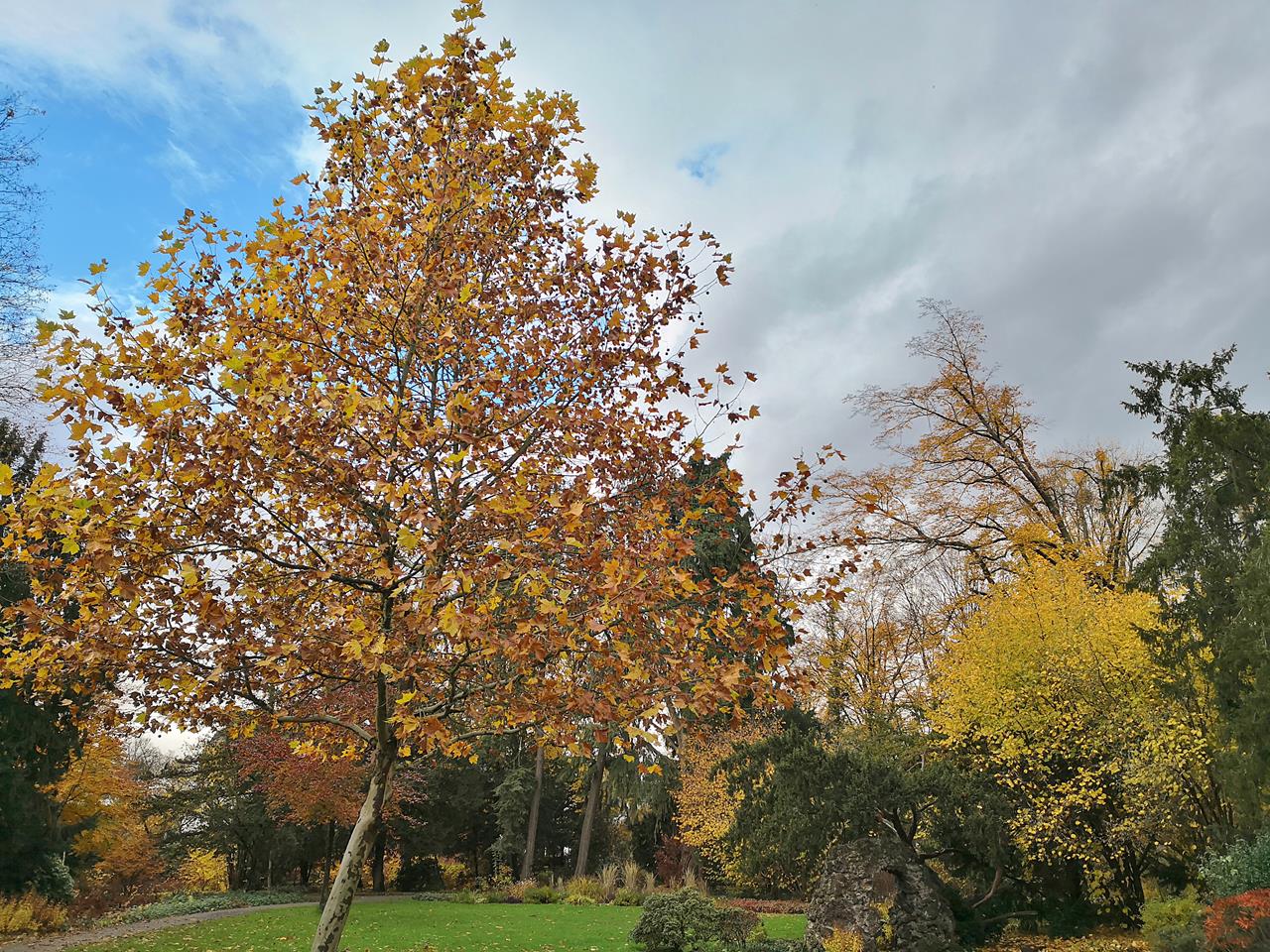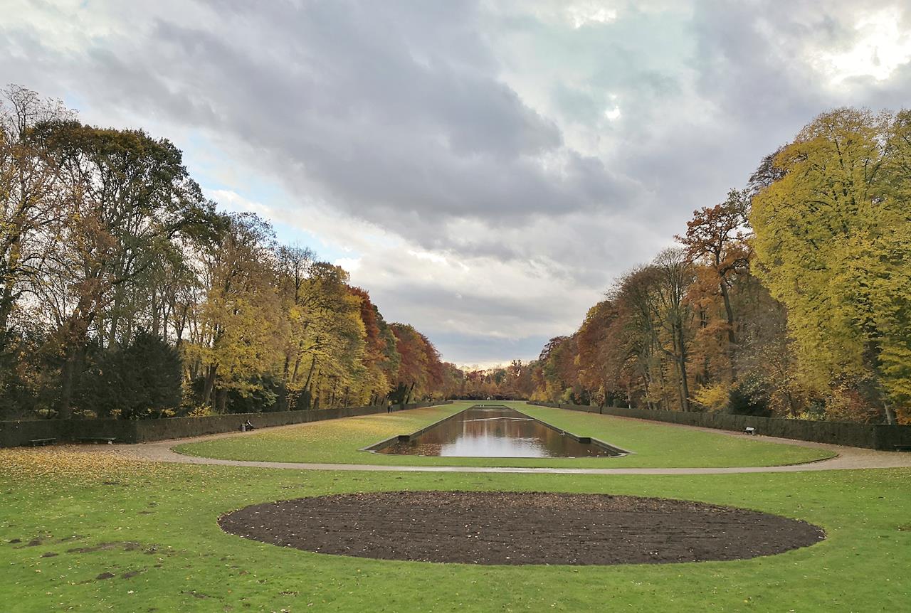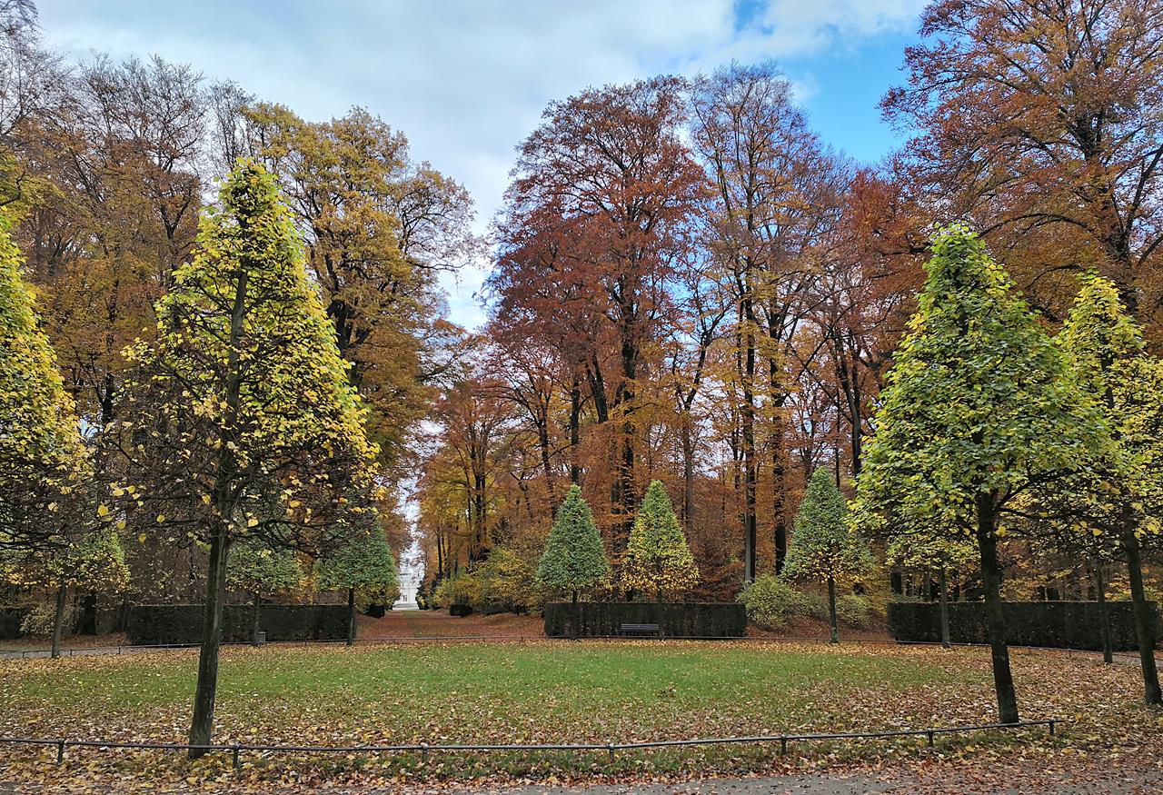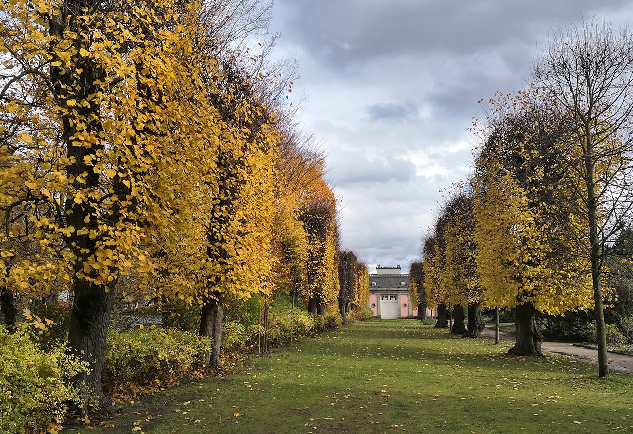 Der große Park mit seinen sternförmigen Sichtachsen ist zu jeder Jahreszeit einen Besuch wert. Doch gerade jetzt, wo Buchen, Akazien und Ginkgos ihr herbstlich-buntes Farbenspiel präsentieren, macht die Parklandschaft besonders viel her. Ein Traum in Gelb, Orange und Rot.