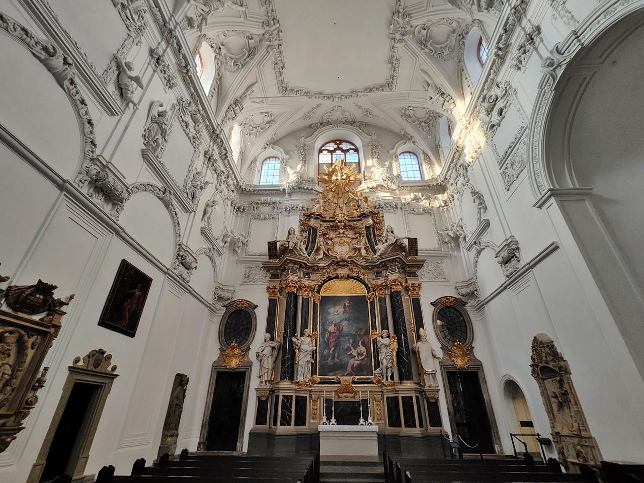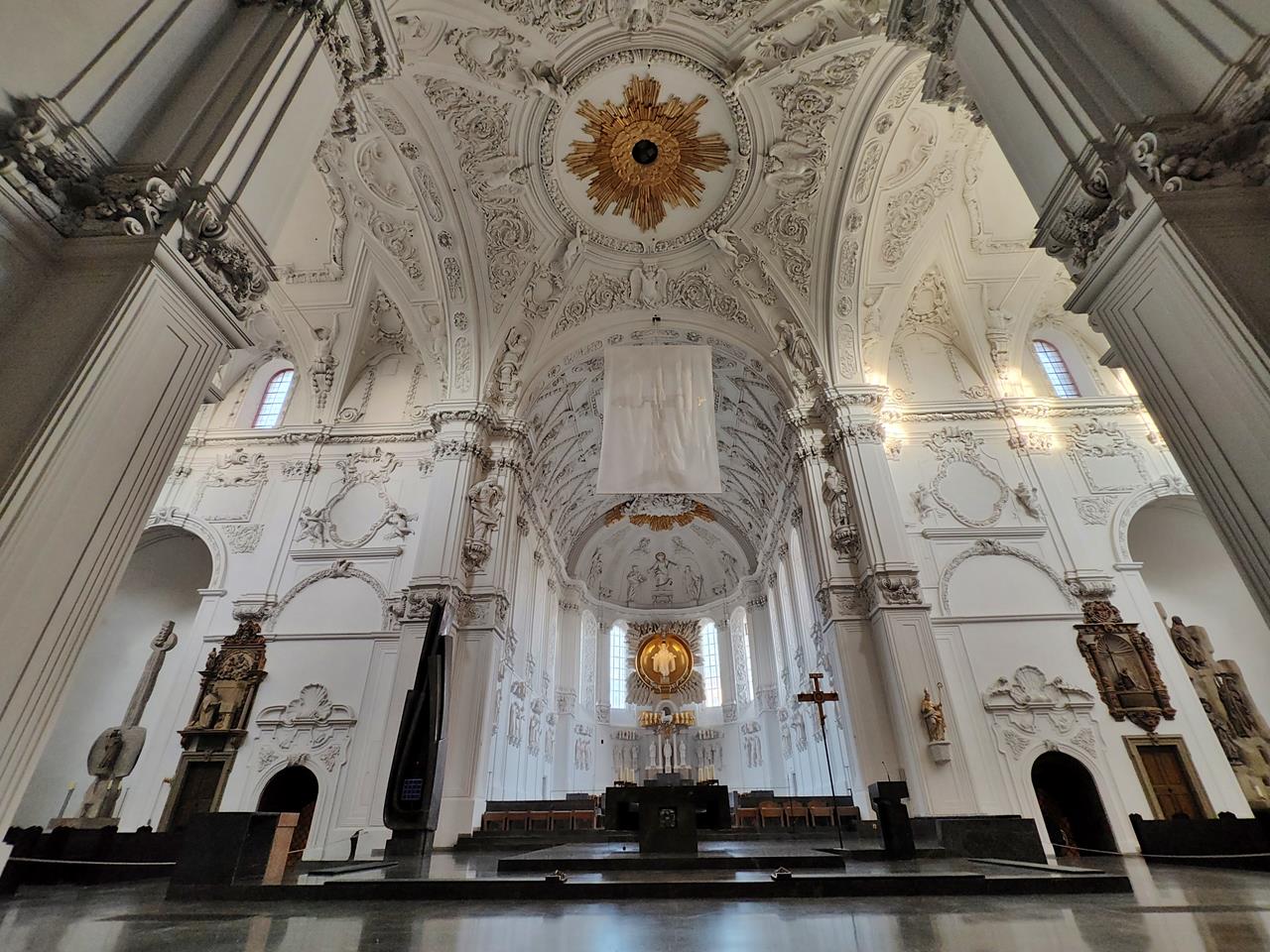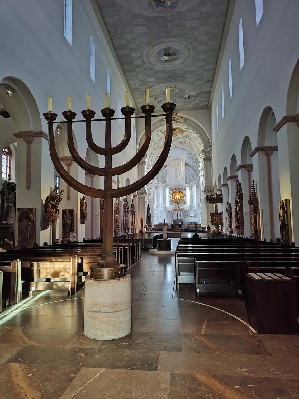 Das ist doch mal ein prächtiges Gotteshaus nach meinem Geschmack: Seit einer Umgestaltung im Jahr 1988 präsentieren sich das Langhaus, der Altarraum und der Chor des St.-Kilians-Doms weitgehend in Weiß als eine Mischung aus modernen und Barock-Elementen. Im Mittelgang begrüßt den Besucher beim Eintritt eine großformatige Menora auf einem steinernen Sockel.
