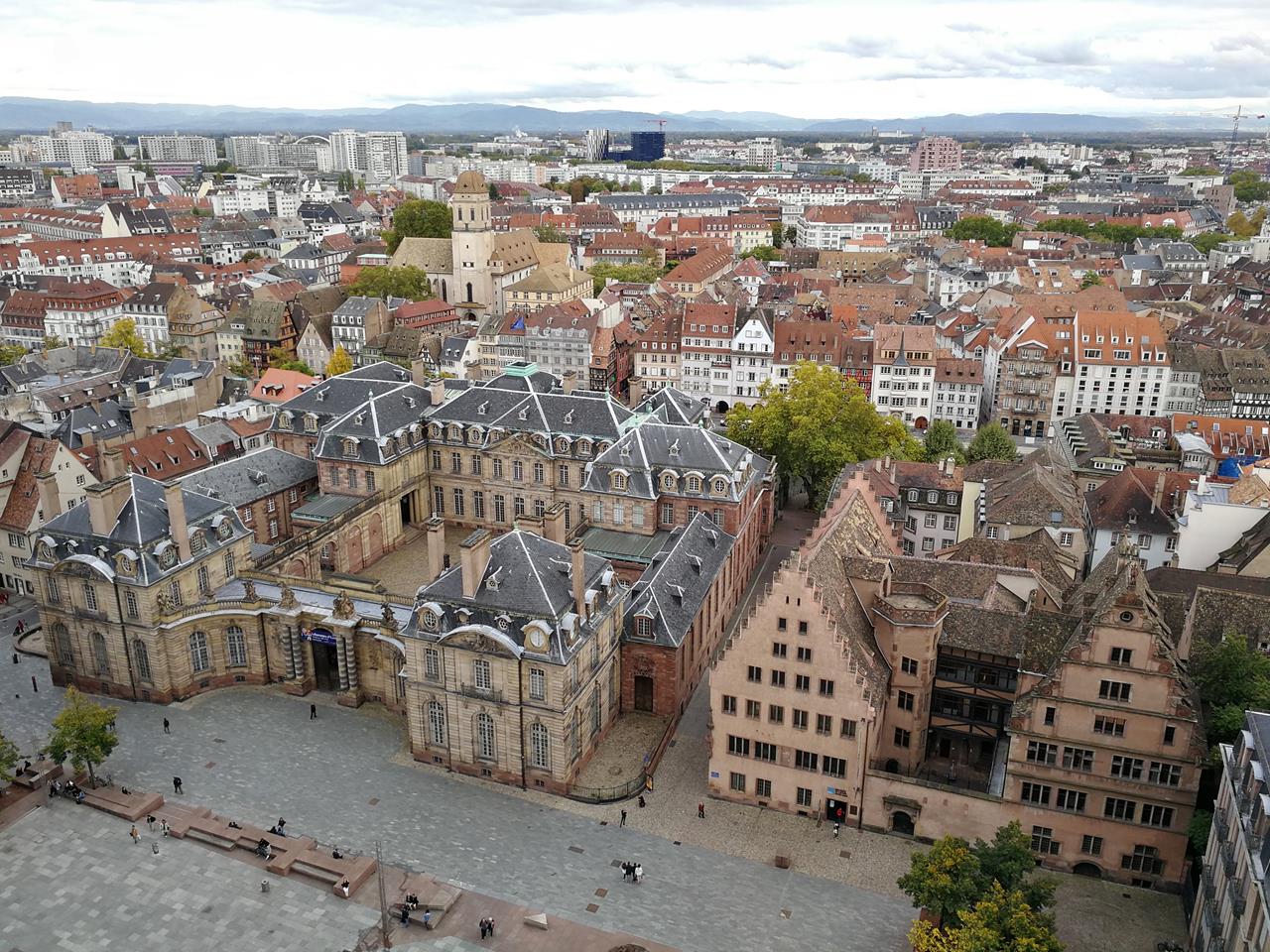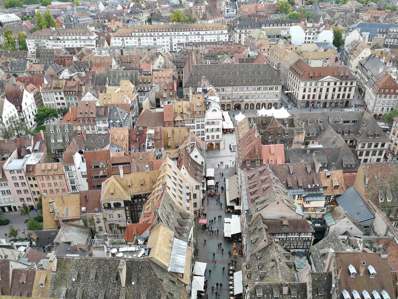 Nach dem Aufstieg auf den Nordturm genieße ich den wunderbaren Blick über die Stadt. Im Osten erheben sich die Vogesen, im Westen der Schwarzwald. Ein tolles Panorama, für das sich der Aufstieg über die insgesamt 333 Treppenstufen absolut gelohnt hat.