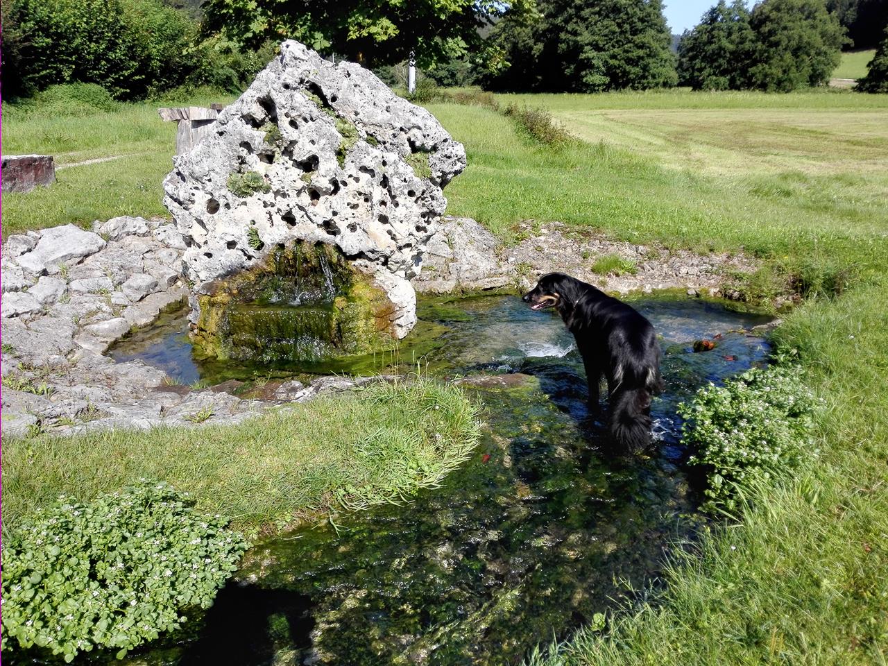 Über eine Strecke von mehr als zehn Kilometern folgen wir dem Lauf des Wasser durch Wiesen und Felder. Doxi genießt es.