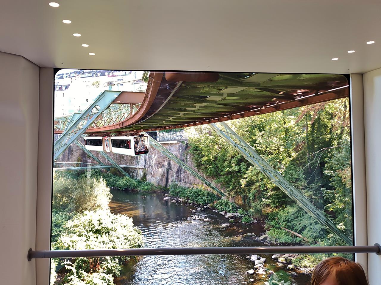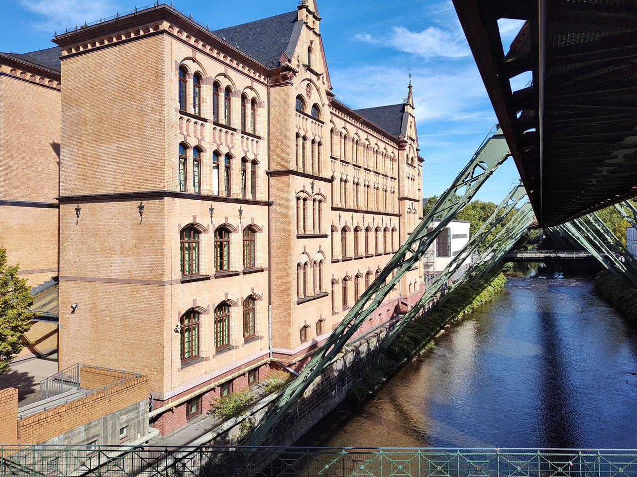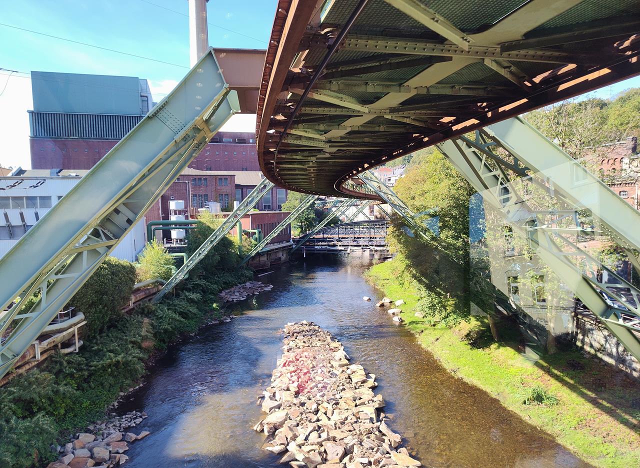 Wuppertal erstreckt sich links und rechts des Flusses in einem schmalen Tal, das von den steilen Hügeln des Bergischen Landes eingefasst wird.Und weil es dort nicht viel Platz gibt, kamen die Stadtväter am Ende des 19. Jahrhunderts auf die geniale Idee, den unbebauten Raum über dem Fluss für den öffentlichen Personennahverkehr zu nutzen.