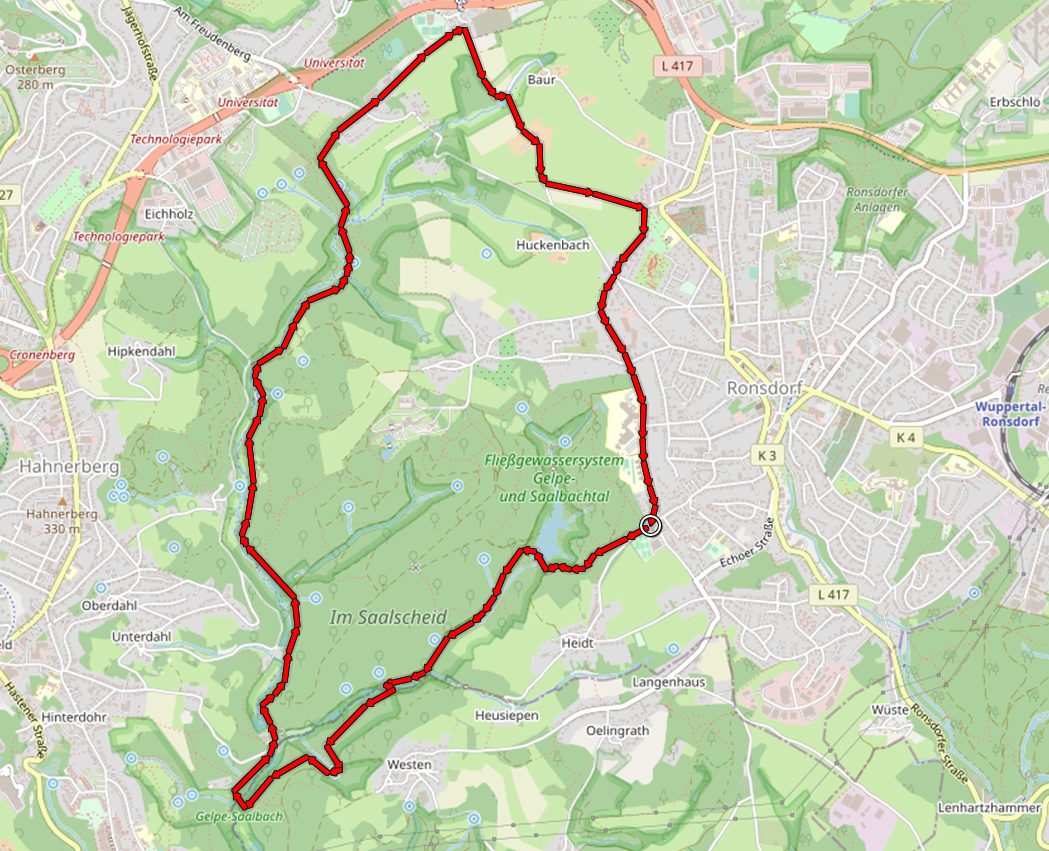 Wir starten am Rande von Wuppertal-Ronsdorf und steigen unmittelbar zur Ronsdorfer Talsperre hinab, die den Saalbach aufstaut. Das umgebende Waldgebiet nennt sich „Im Saalscheid“ und ist eines der schönsten Naherholungsgebiete von Wuppertal.