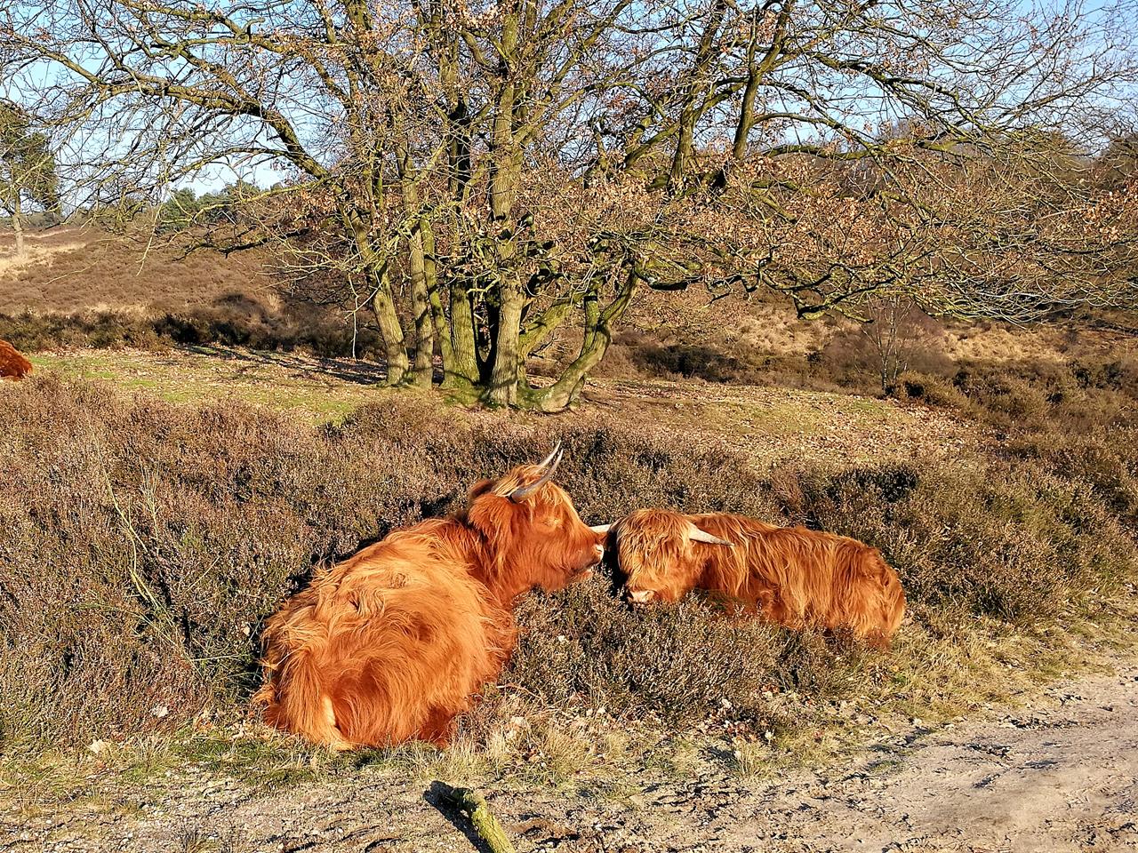 Frei laufende Galloway-Rinder am Wegesrand in der Mookerheide