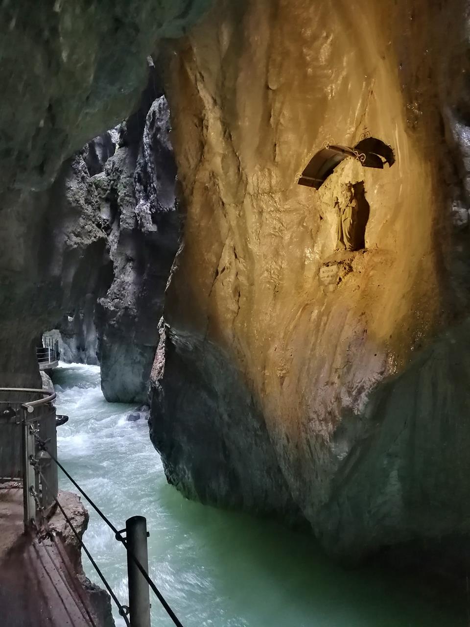 In den Spitzenzeiten sind ganze Menschenmassen vom Parkplatz an der Olympiaschanze zum Eingang der Klamm unterwegs. Wir sind jedoch so früh dran, dass wir das Naturschauspiel gemeinsam mit einem japanischen Ehepaar für uns allein haben.Die Schlucht wurde schon im 18. Jahrhundert von Einheimischen begangen, die unter Lebensgefahr gefällte Bäume und Brennholz aus dem Reintal auf dem Wasser der Partnach nach Partenkirchen transportierten. Beim Lösen verkeilter Baumstämme sind immer wieder Männer ums Leben gekommen. Davon berichten Bildtafeln an einem Wegkreuz zwischen dem Olympiastadion und dem Eingang zur Klamm.