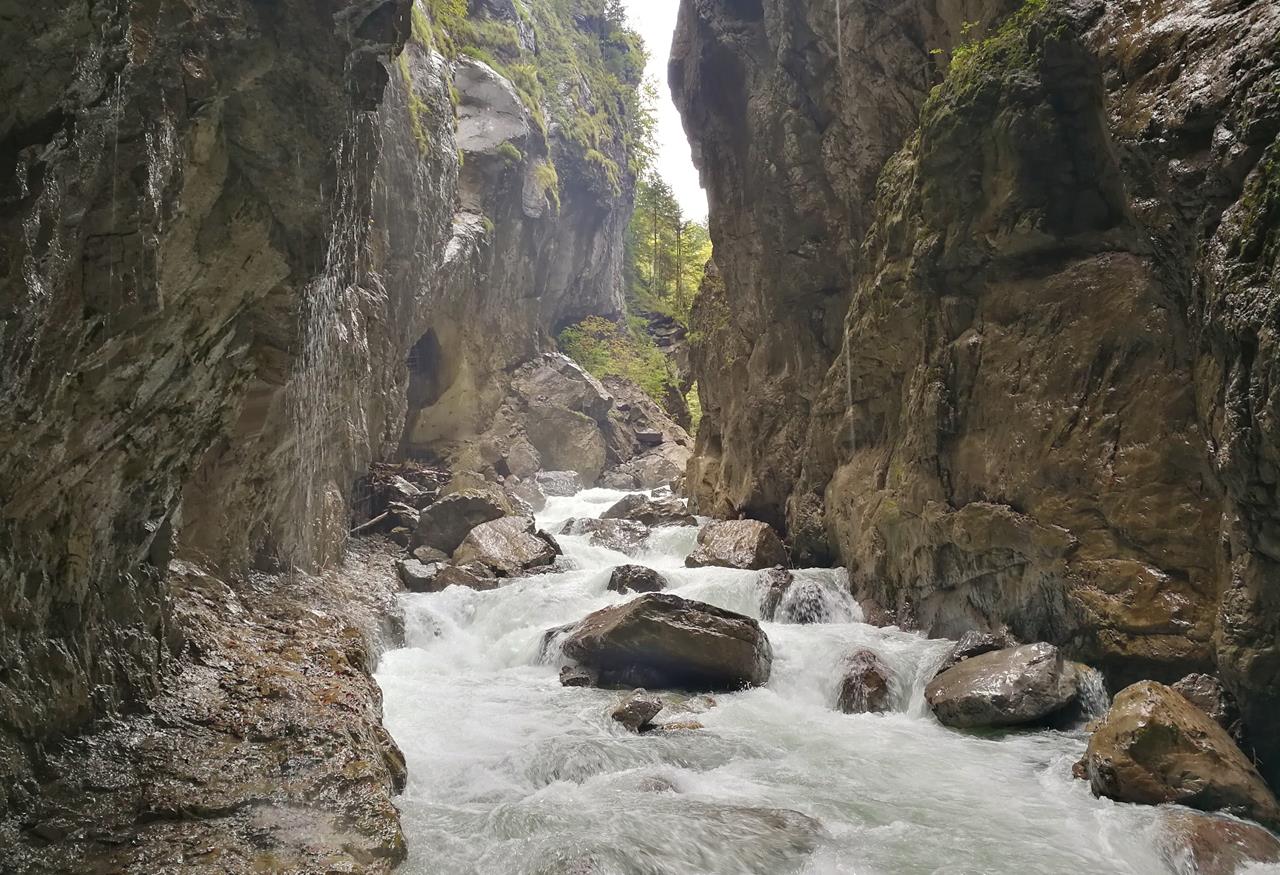 Laut tosend stürzt das Wasser der Partnach durch die Klamm. Auf der linken Seite befindet sich der künstlich angelegte Steg.