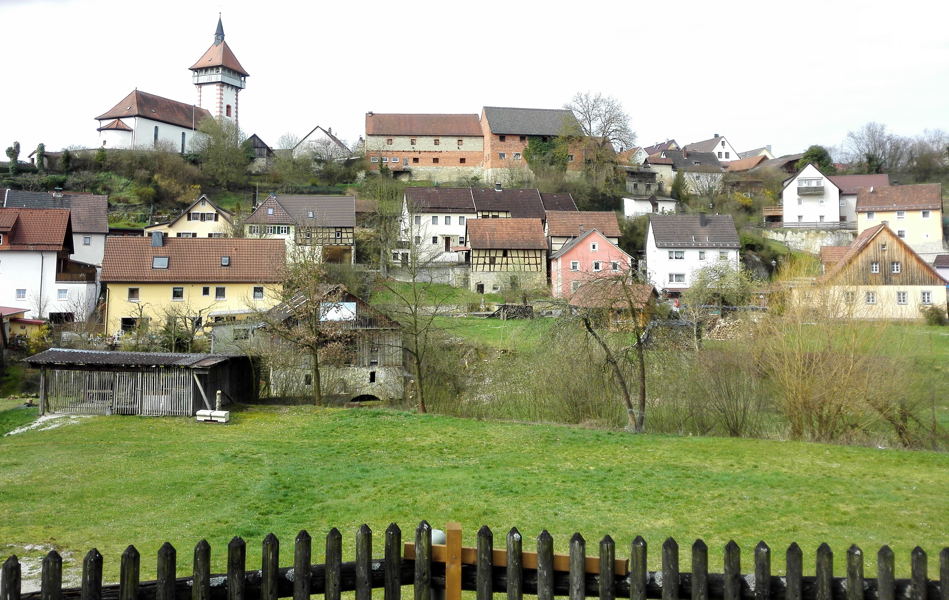 Beim Dorf Kainach beginnt unser Aufstieg auf das Hochplateau. Der Weg führt entlang der für die Fränkische Schweiz typischen Magerrasenhängen, die hier mit Wachholderbüschen bewachsen sind.Auf dem Hochplateau angekommen ist in der Ferne bereits die Burg Sanspareil zu erkennen, die wir über den Ort Wonsees erreichen.