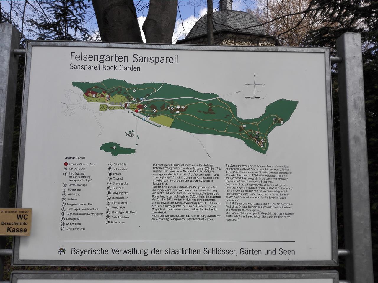 Am Fuße der gut erhaltenen Burg erstreckt sich in einem Buchenhain ein Felsengarten, den einst die Markgräfin Wilhelmine zu Bayreuth anlegen ließ. Es war die Epoche, in der Grotten, Höhlen und Ruinenkulissen beim romantisierenden deutschen Adel hoch im Kurs standen.