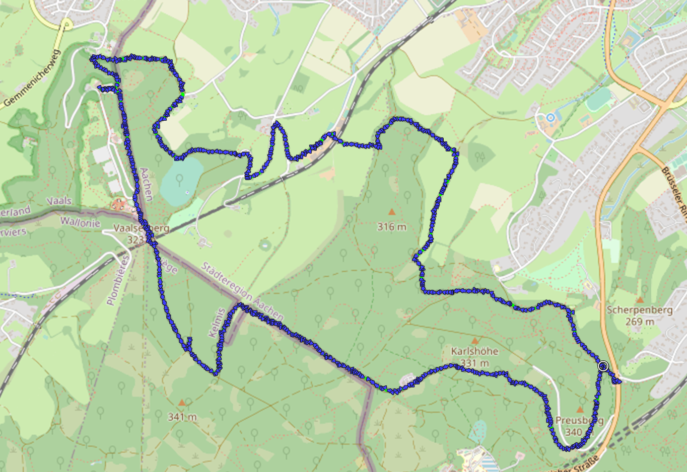 Entlang der Deutsch-Belgischen-Grenze wanderten wir weiter durch den Wald und in ein kleines Tal, bis wir am Aufstieg zum Preußberg wieder deutsches Gebiet erreichten. Dort konnten wir schon von weitem den „Mulleklenkes“ erblicken, den Aachener Fernmeldeturm. Mit dem Erreichen des Turms waren es nur noch rund zwei Kilometer bis zu unserem Ausgangspunkt an der Waldschenke.