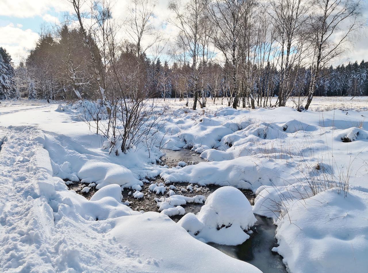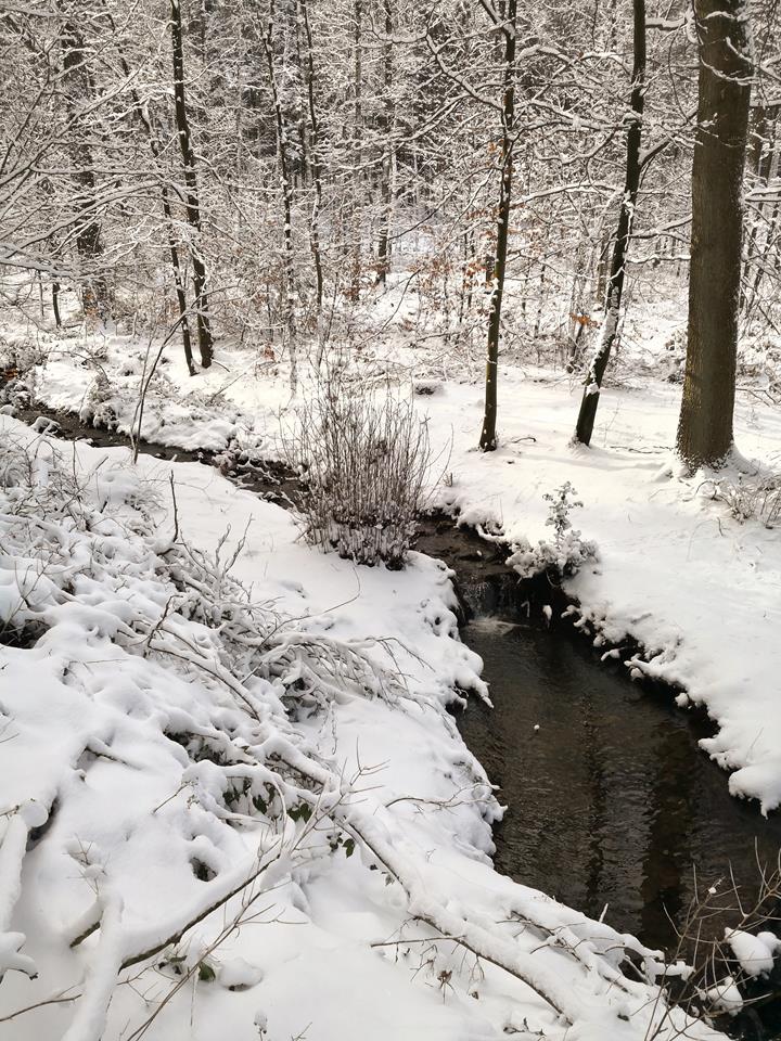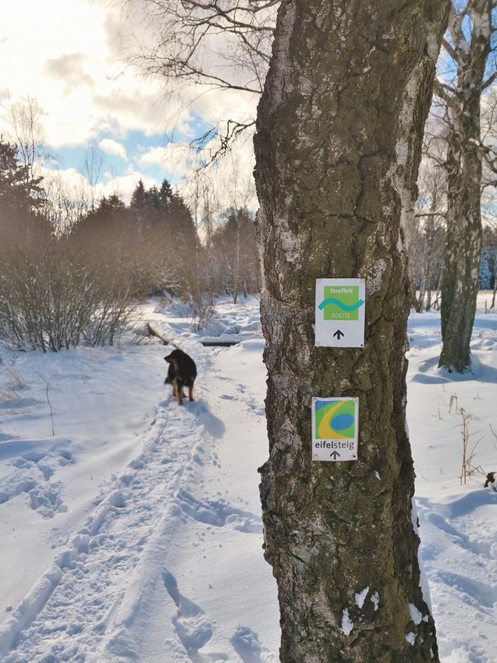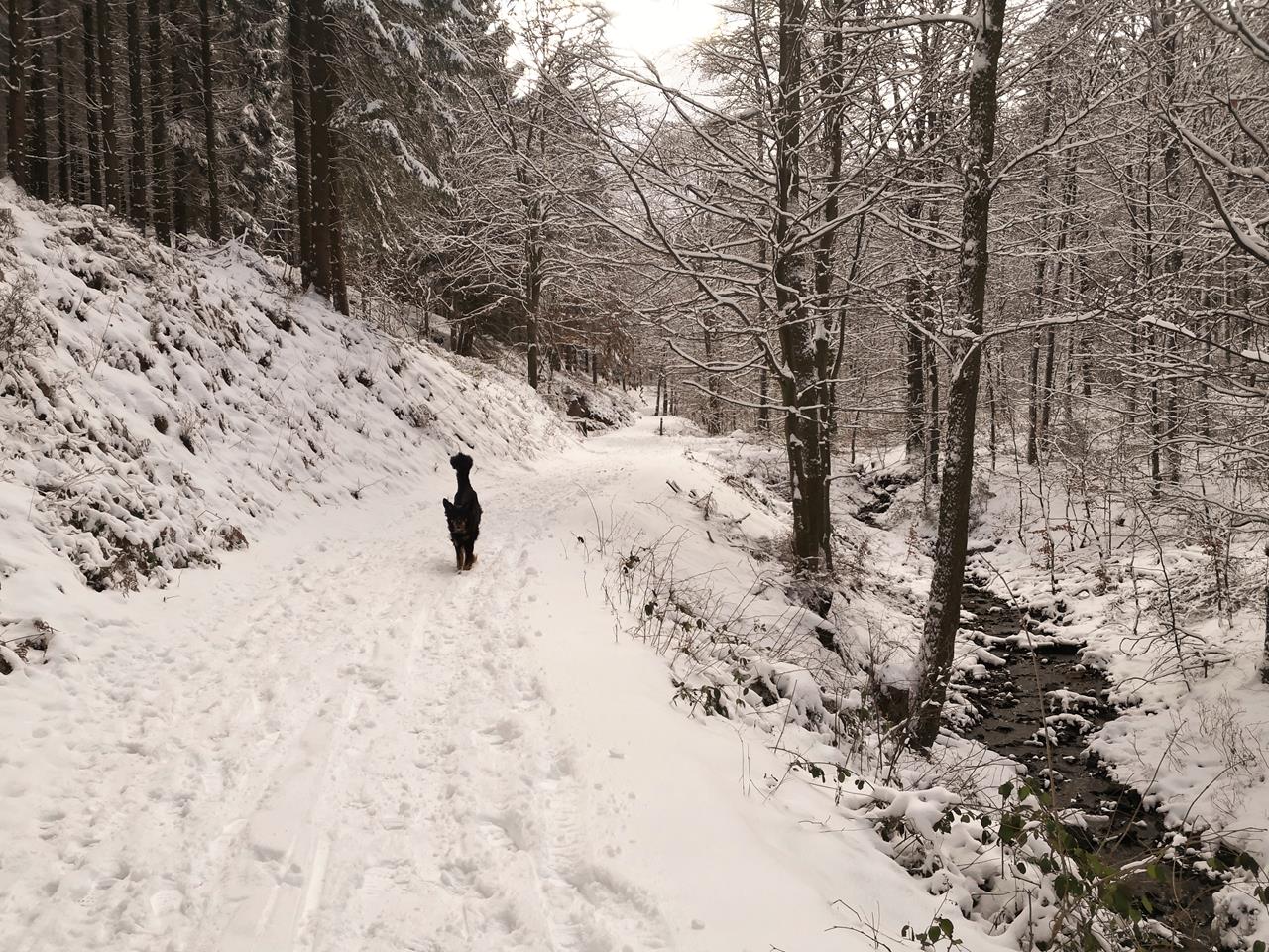 Wir wollen in das NSG Struffelt, das einige der wenigen Vennflächen auf deutscher Seite im Deutsch-Belgischen-Grenzgebiet umschließt. Vom Ortsrand von Rott wandern wir entlang eines Baches hinauf in das schöne Naturschutzgebiet. Doxi hat mächtig Spaß an der weißen Pracht und rollt sich unterwegs immer wieder mit großer Begeisterung im Schnee ab.