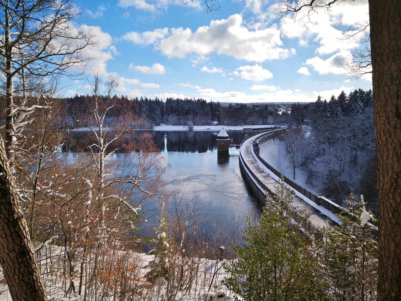 Auf einigen der Seitenwege sind wir tatsächlich die ersten Spaziergänger seit dem gestrigen Tag – dort ist der frische Schnee noch vollkommen unberührt. Als wir den Wald verlassen und uns den offenen Vennflächen nähern, kommt sogar die Sonne raus. Sofort fängt es überall um uns herum an, prächtig zu glitzern. Richtig malerisch sieht die Winterlandschaft jetzt aus.Auf verschneiten Holzstegen durchqueren wir das Venn und steigen dahinter zur Dreilägerbachtalsperre ab. Die große Talsperre hat eine wichtige Funktion für die Trinkwasserversorgung in der Region südlich von Aachen hat. Sie ist zurzeit halb zugefroren.