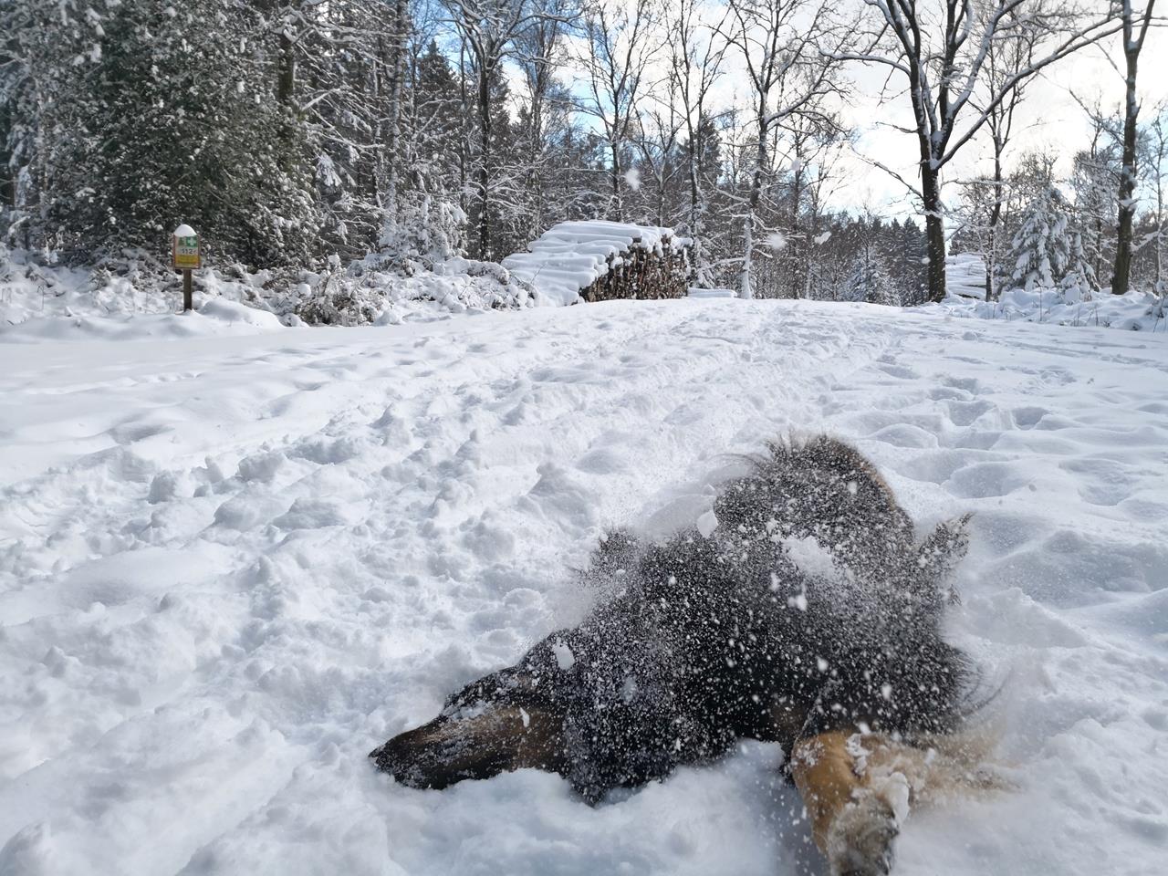 Aber heute nicht. Wir sind ganz allein unterwegs und kommen stellenweise kaum voran, angesichts von so viel Neuschnee. Das ist doch mal was ganz Feines! Doxi hat auch Riesenspaß.