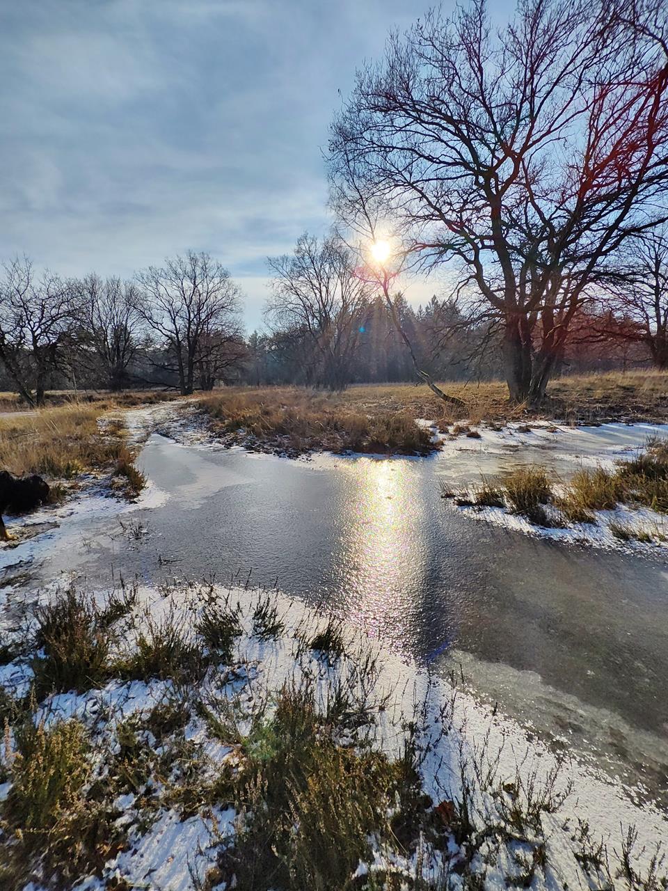 Heute bin ich erneut hier, diesmal mit Heike und bei herrlichem Hochdruck-Winterwetter mit Minustemperaturen und ganz viel Sonne. Über Teilen der Landschaft liegt ein klein wenig Schnee und viele der Wasserflächen sind zugefroren.Wir drehen eine 13 km lange Runde erst durch die Herkenbosscherheide und dann weiter nach Süden in den niederländischen Nationalpark „De Meinweg“. Dort begegnen wir einer Gruppe von schwarzen Wildrindern, die das ganze Jahr in der Heide unterwegs sind.