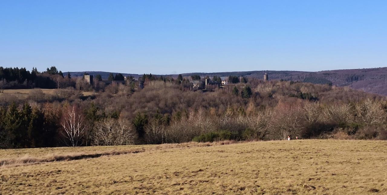 Der wunderschöne Schuld-Panoramaweg No 6 führt Heike und mich auf einer Länge von 12 km erst von Schuld entlang des Ahrsteigs steil hinauf auf die Ahrhöhen in Richtung Winnerath. Auf den Feldern zwischen Winnerath und Insul genießen wir die einladenden Strahlen der Wintersonne und weite Fernblicke in die Ahreifel. Bis auf die Schüsse der Jäger und das Gebell ihrer Hunde in der Ferne ist es hier oben ganz still. Nur ab und zu hört man die ersten Vöglein zwitschern.