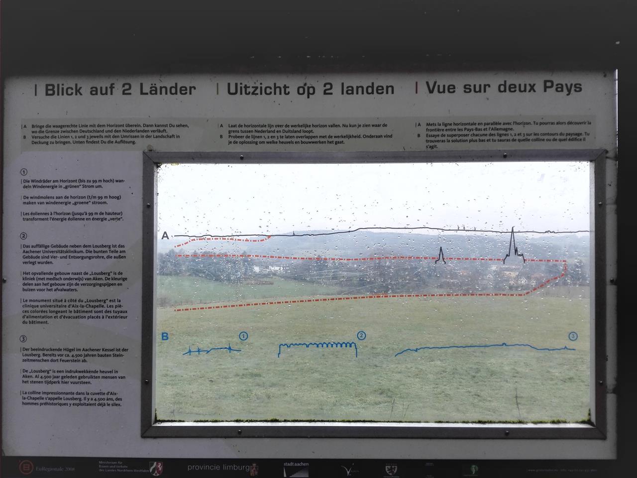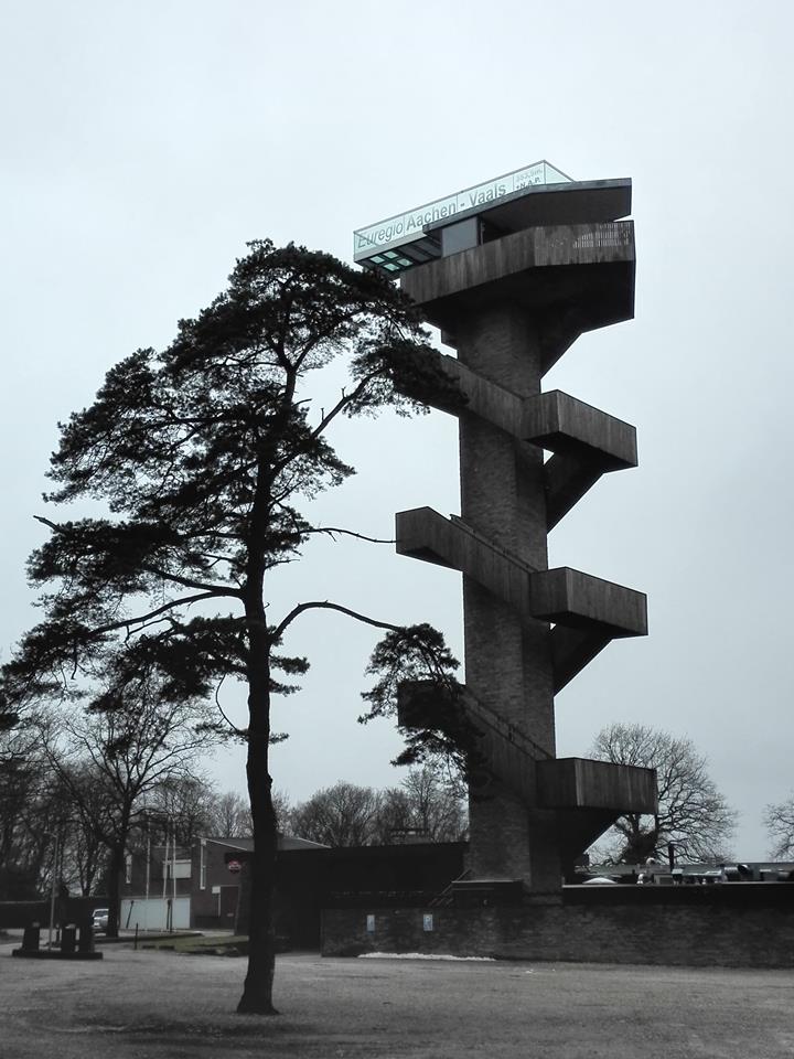 Nach einem Aufstieg durch Wald und Feld entlang des mittelalterlichen „inneren Landgrabens“ (mit schönem Blick auf Aachen) erreichten wir unterhalb des Vaalsbergs den ersten Aussichtsturm auf niederländischem Staatsgebiet.Kaum mehr als zwei Kilometer weiter passierten wir das eigentliche Dreiländereck am Vaalsberg, wo sich der höchste Punkt der Niederlande auf dem europäischen Festland befindet (ein Berg auf den Niederländischen Antillen ist noch höher).