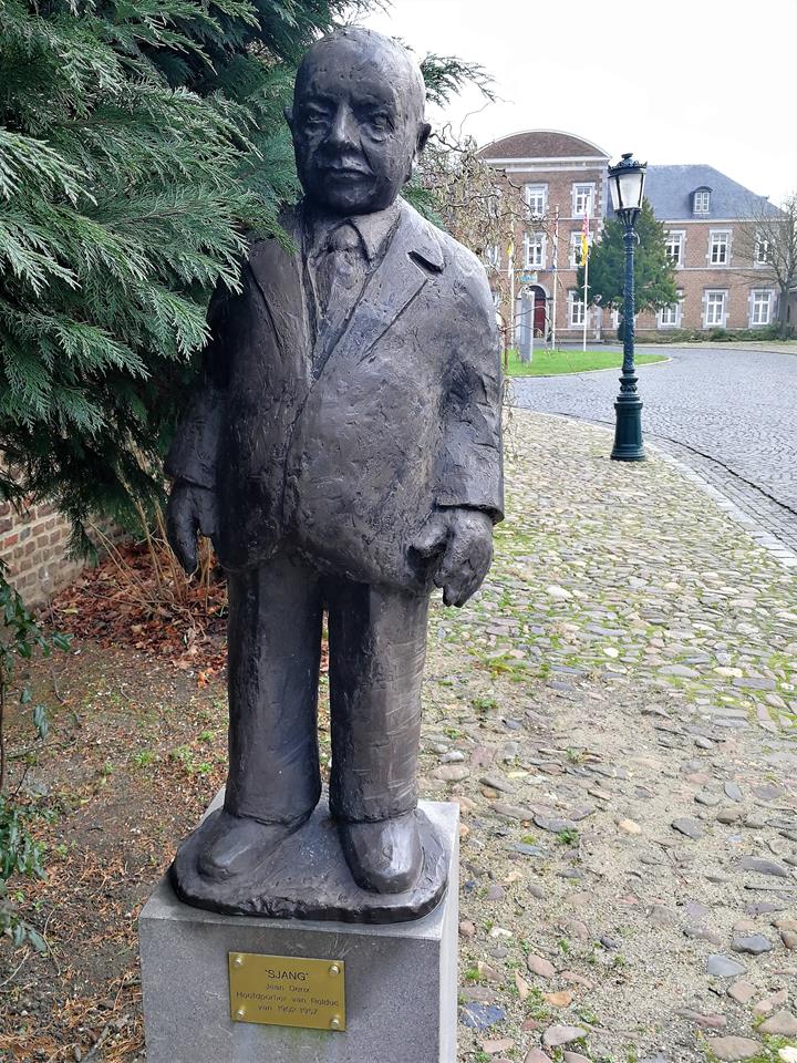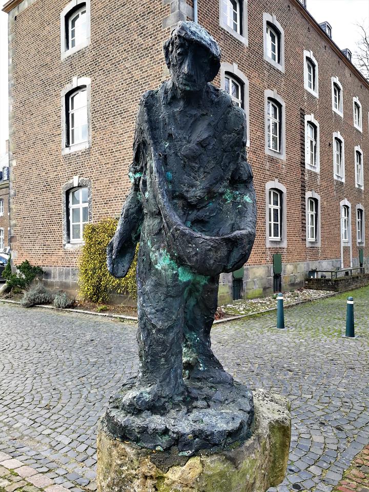 Von der Kammhöhe blicken wir nun auf den Ortsrand von Kerkrade. Zu unserer linken ist der Kirchturm der ehemaligen Abtei Rolduc zu sehen. Wir laufen in das Zentrum von Kerkrade und wundern uns über die vielen liebevoll dekorierten Wohnzimmerfenster mit Karnevalsmotiven. Offensichtlich spielt die fünfte Jahreszeit hier eine große Rolle.