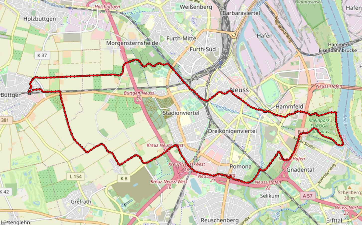 Etwas mehr als fünf Stunden waren wir unterwegs auf unserem Weg von Büttgen über Lanzerath, den Eselspfad, die Neusser Pomona und den Reuschenberger Busch zum Rheinpark und dem Yachthafen an der Mündung der Erft in den Rhein.Am Rhein haben wir einen Moment Innegehalten, Doxi hat Stöckchen aus dem Wasser gefischt, bevor es durch die Neusser Innenstadt und über die Felder zwischen Neuss und Büttgen wieder zurückging.