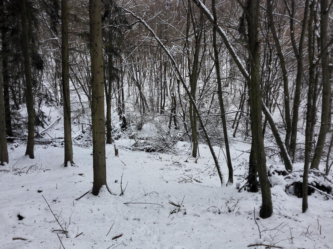 Wir überqueren die Hochfläche und steigen dann ein Stück weit in Richtung des angrenzenden Rurtals hinab. Kurz vor Hirschrott machen wir kehrt und begeben uns auf den Rückweg. Glücklicherweise sind auf diesem Teil der Hochfläche nicht mehr so viele Schneeverwehungen zu durchqueren.