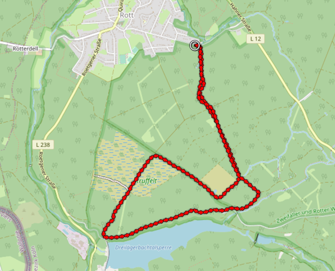 Wir laufen entlang des Nordrands der Talsperre und drehen dann wieder Richtung Rott ab. Ein kleines Stück müssen wir abseits aller Forstwege durch den Wald laufen. Dabei sinken wir ganz schön tief in den Schnee ein – bestimmt dreißig bis vierzig Zentimeter. Gut, dass ich entsprechend angezogen bin. Aber richtig anstrengend ist das.
