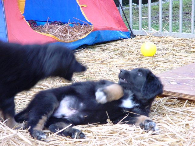Die Kleinen können sich ganz schön gegenseitig bezanken. Meistens läuft es nach folgendem Muster: Einer liegt unten und wird angeknabbert, bis er knurrt, bellt und sich wehrt. Dann dreht sich das ganze Spiel um und ein anderer kommt ran. Hauptsache, es ist immer was los.