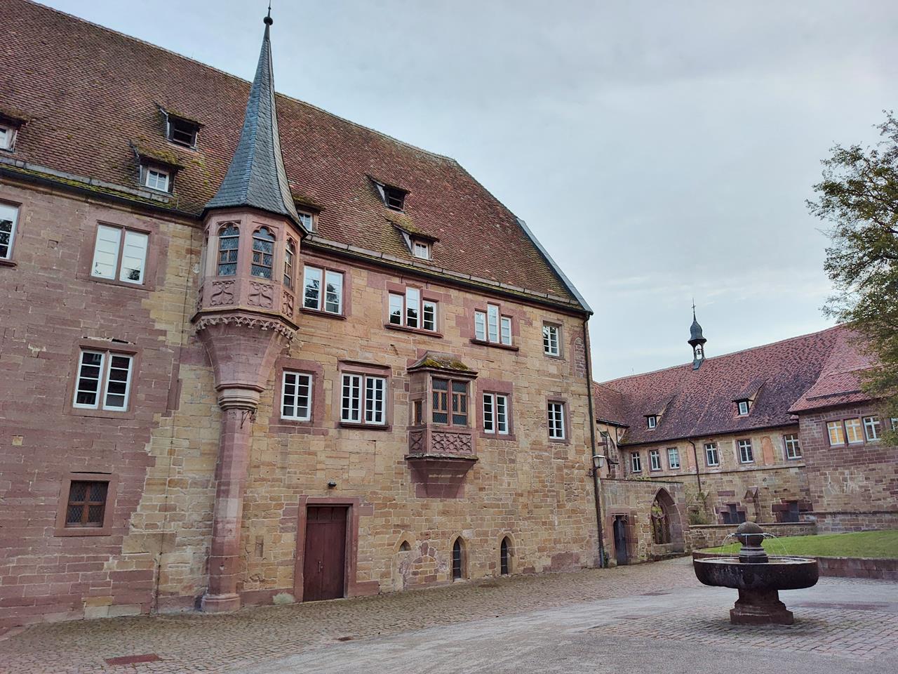 Brunnen im Klosterhof vor dem Cellarium (Mitte) und der Klosterkirche (rechts)