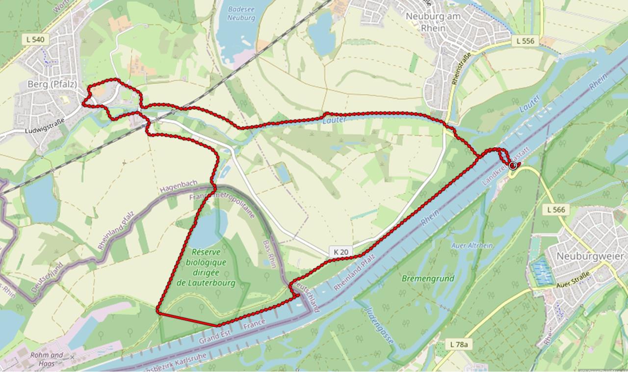 Wir laufen durch die Felder nach Berg (Pfalz), dem südlichsten Ort von Rheinland-Pfalz und dann am Deich der (neuen) Lauter in Richtung Neuburg am Rhein und zurück zur Fähre.